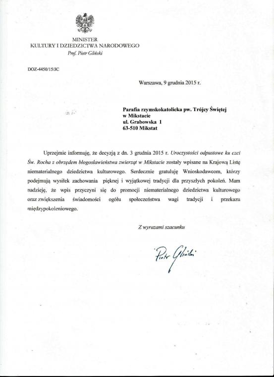 Ważny w wydarzenie i wyróżnienia był ten rok dla znajdującego się na terenie parafii Diecezjalnego Sanktuarium Świętego Rocha. 14 października podczas Gali Niematerialnego Dziedzictwa Kulturowego w Krakowskich Sukiennicach ks. kan. Krzysztof Ordziniak, który jest Kustoszem sanktuarium odebrał decyzję Ministra Kultury i Dziedzictwa Narodowego o wpisie uroczystości odpustowych ku czci Świętego Rocha z obrzędem błogosławieństwa zwierząt na Krajową Listę Niematerialnego dziedzictwa kulturowego. Jesteśmy jedyną parafią w Wielkopolsce, która znajduje się na tej reprezentatywnej liście. W listopadzie podczas obchodów 25 -lecia Opolskiej Izby Lekarsko- Weterynaryjnej ks. kan. Krzysztof odebrał medal Świętego Rocha przyznany dla sanktuarium za promocję Świętego Rocha - patrona lekarzy weterynarii.