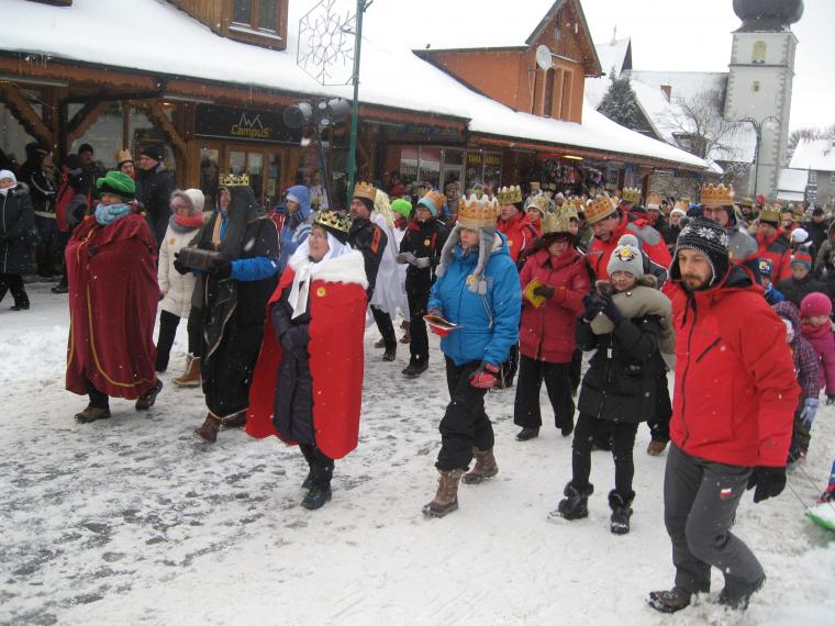 Już po raz trzeci w parafii Nawiedzenia Najświętszej Marii Panny w Karpaczu wyruszył Orszak Trzech Króli. Kilkaset osób przemaszerowało ulicami Karpacza przy akompaniamencie kolęd oraz młodych aktorów z naszych szkół, którzy przedstawiali scenki jasełkowe. Orszak Trzech Króli już mocno wpisał się w tradycję naszej parafii. Uczestnictwo w barwnym pochodzie jest manifestacją przywiązania do życia zgodnego z tradycjami wiary i wartości chrześcijańskich. Zgodnie z rozpoczętą tradycją w naszej parafii nie zabrakło „szczodraków”. Chociaż było ich dużo, niestety nie wystarczyło dla wszystkich. Każdy chciał spróbować. Wypieki na kiermasz przygotowała kawiarnia „Spokojna”, za co serdecznie dziękujemy pani Elżbiecie Godyń. Dochód ze sprzedaży „Szczodraków” został przeznaczony na potrzeby naszej drużyny harcerskiej. Mimo mroźnej pogody frekwencja dopisała. Rozdano ponad 200 koron, których także zabrakło. Podczas Orszaku towarzyszyły nam zwierzęta z miasteczka Western City, za co składamy podziękowania panu Jerzemu Pokojowi. W tym roku spotkała nas miła niespodzianka. W orszaku pojawili się Mędrcy, którzy przybyli z diecezji zielonogórsko-gorzowskiej, z Głogowa. W rozmowie zdradzili nam, że co roku pojawiają się w innym mieście w uroczystość Objawienia Pańskiego.