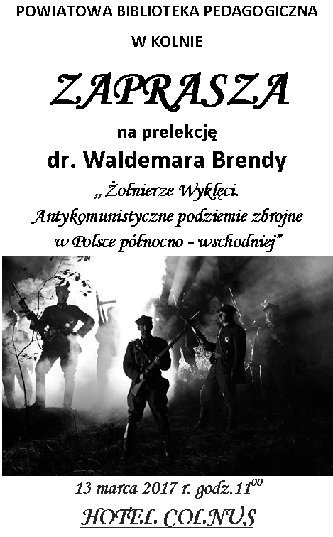 Autor/źródło: http://www.powiatkolno.pl/86-urzad/aktualnosci/946-prelekcja-dr-waldemara-brendy-zolnierze-wykleci-antykomunistyczne-podziemie-zbrojne-w-polsce-polnocno-wschodniej.html