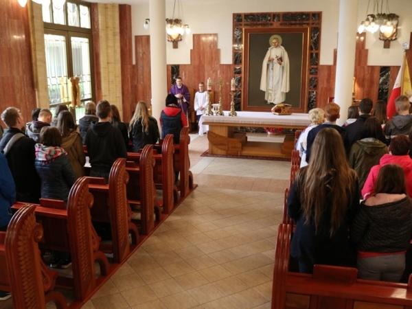 Eucharystii w kaplicy poświęconej św. o. Stanisławowi Papczyńskiemu, założycielowi Zgromadzenia Księży Marianów, przewodniczył ks. Adam Grabowski, wikariusz parafii pw. Niepokalanego Poczęcia NMP w Krzymowie, który we wspomnianej szkole pracuje jako katecheta.W pielgrzymce wzięło udział 38 uczniów klas III Gimnazjum im. papieża Jana Pawła II w Krzymowa. Tegoroczna pielgrzymka była 15. z kolei.