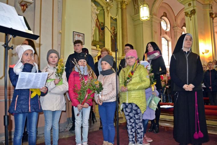 Około godz. 11:00 na mikstacki Rynek zaczęły przychodzić dzieci z palmami w rękach, ale nie brakowało także osób dorosłych. O godz. 11:00 w mikstackim wieczerniku w niedziele sprawowana jest Msza Święta ze szczególnym udziałem dzieci i młodzieży. O godzinie jedenastej w asyście ministrantów niosących krzyż na Rynek przybył ks. wikariusz Krzysztof Lipiński, który po odmówieniu specjalnej modlitwy pobłogosławił palmowe gałązki. Następnie procesjonalnie za krzyżem zgromadzeni na Rynku młodsi i starsi parafianie ze śpiewem na ustach, z palmami w rękach udali się na Mszę Świętą do kościoła farnego. Tu ks. Krzysztof pobłogosławił palmy zgromadzonych w kościele, następnie rozpoczęła się Msza Święta podczas której odczytany został opis Męki Pańskiej. Podczas Mszy Świętej śpiewał parafialny zespół młodzieżowy.