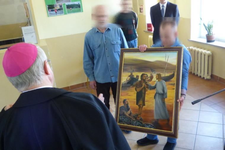 Przed Mszą św. w więziennej kaplicy, ksiądz biskup odwiedził chorych w miejscowym szpitalu i spotkał się z personelem medycznym. Na spotkaniu z więźniami, najpierw osadzeni powitali Biskupa krótkim koncertem muzycznym, oraz wręczyli mu na pamiątkę obraz namalowany przez jednego z nich. Obraz nawiązuje do wypowiedzianych przez Jezusa pod adresem św. Piotra słów: „Duc in altum – wypłyń na głębię”.