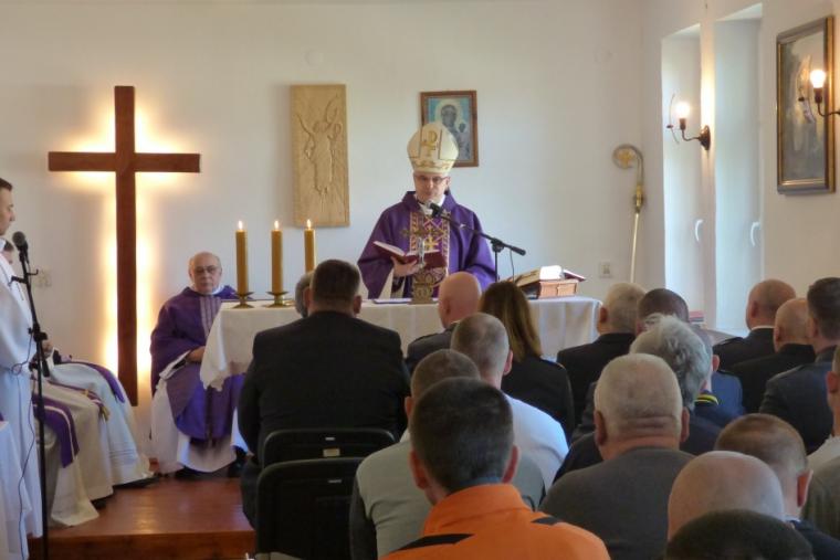 - Każdego roku kiedy zbliżają się Święta Wielkanocne, przybywamy tutaj do Zakładu Karnego, ale myślimy też o Aresztach Śledczych, które odwiedzamy w innym czasie w ciągu roku. Przybywamy tu jako biskupi z przesłaniem, które niesie ze sobą klimat, rzeczywistość Świąt Paschalnych, a więc przekonanie, że to dla mnie i dla mojego zbawienia, Bóg przyszedł na świat, że posłał swojego Syna, abym żył nie tylko te 20, 50 czy 80 lat, ale żebym żył wiecznie. Chcę tu wśród osadzonych zostawić takie przekonanie, żeby mieli nie tylko wiarę, ale i pewność, że jest Bóg, że posłał swojego Syna Jezusa Chrystusa, który kocha każdego z nas, który ma wobec każdego swój plan zbawienia. A nam nie pozostaje nic innego, jak tylko podjąć – może czasem na nowo - realizację tego Bożego planu. To jest nic innego, jak droga świętości. Czas więzienia, czas przebywania w zakładzie karnym, może być również okazją do tego, żeby podjąć refleksję nad swoim życiem, postępowaniem, nawróceniem i powrotem do innego świata. Świata; w którym jest Bóg, w którym są ci, z którymi razem idziemy do nieba; przekonania, że mimo naszej niewierności, Bóg pozostaje zawsze wierny i zawsze nas kocha – mówił o tym wydarzeniu biskup Marek Mendyk