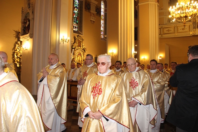 Na początku Eucharystii ks. prał. Adam Modliński powitał biskupów i kapłanów. Przypomniał, że w tym roku diecezja kaliska świętuje jubileusz 25-lecia powstania. – Wczoraj, 12 kwietnia, minęło 25 lat od uroczystego ingresu pierwszego biskupa kaliskiego do katedry – powiedział proboszcz katedry. Dodał, że od 1992 r. dla diecezji kaliskiej wyświęcono 305 kapłanów. Wspomniał też zmarłych księży. Zaznaczył, że w ciągu 25 lat istnienia diecezji kaliskiej odeszło do Pana 169 kapłanów. Pozdrowił również jubilatów obchodzących 60., 50. i 25. rocznicę święceń kapłańskich. Zaznaczył, że księża zgromadzeni w kaliskiej katedrze łączą się duchowo z kapłanami przebywającymi poza granicami kraju.