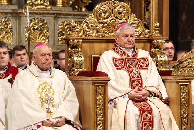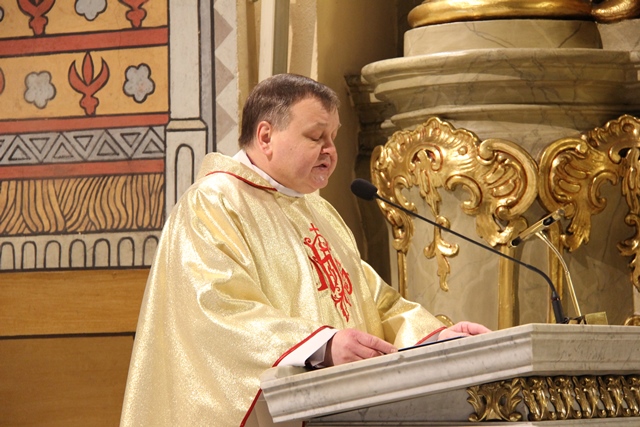 W homilii biskup kaliski zachęcał duchownych do odkrywania na nowo swojego kapłaństwa. – W roku jubileuszowym 25-lecia istnienia diecezji kaliskiej staramy się na nowo odkryć tożsamość kapłańską, aby jeszcze gorliwej pracować w winnicy Pańskiej. Wewnętrzna formacja kapłańska z natury rzeczy nastawiona jest na ciągły rozwój i wzrost – mówił celebrans. Podkreślał, że kapłani poprzez Słowo Boże, sakramenty święte i ewangelizację budują Kościół święty, który jest komunią, a nie organizacją użyteczności publicznej. – Niestety, wielu publicystów wypowiadających się na łamach prasy na temat Kościoła, chciałoby go sprowadzić tylko do jakiejś organizacji charytatywnej lub filantropijnej – powiedział kaznodzieja. Dodał, że akcja charytatywna to tylko jeden z aspektów działalności Kościoła, ważny, ale nie najważniejszy. – Zadaniem Kościoła jest misja zbawienia człowieka i w tę misję musi być wpisane nasze kapłaństwo – stwierdził bp Janiak. Zaznaczył, że współczesny świat jest dotknięty laicyzmem, który eliminuje z życia człowieka obecność Boga, wartości nadprzyrodzone i moralne kryteria oceny postępowania ludzi. – Z drugiej strony mamy do czynienia z fundamentalizmem religijnym, który prześladuje i morduje w imię religii, w imię Boga, co jest niezgodne z elementarnym poczuciem zdrowej religijności. W tę optykę współczesnej cywilizacji i globalizacji wrzucony jest kapłan, aby mimo wszystkich przeszkód głosił Dobrą Nowinę o zbawieniu – wskazywał hierarcha. Prosił wiernych o modlitwę w intencji księży. – Zwracam się do Was, drodzy wierni, abyście swoją modlitwą wspierali swoich duszpasterzy. Przez dobrą i harmonijną współpracę można dokonać wiele szlachetnych dzieł w parafiach, do których należycie. Niech Wasza dyspozycyjność będzie zachętą dla kapłanów, by jeszcze gorliwiej pracowali dla zbawienia dusz – mówił ordynariusz kaliski. Podziękował księżom za posługę w diecezji kaliskiej. – Chciałbym Wam serdecznie podziękować za Waszą pracę dla dobra Kościoła Kaliskiego. Ten Kościół jest Waszą matką, a matkę trzeba kochać i wiernie jej służyć – powiedział bp Janiak. W czasie uroczystej liturgii biskup kaliski poświęcił krzyżmo oraz oleje chorych i katechumenów.