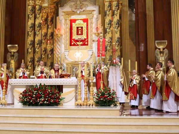 O godz. 12.00 hierarchowie uczestniczyli we Mszy św. przed Cudownym Obrazem Matki Bożej Licheńskiej. Eucharystii przewodniczył abp Tadeusz Kondrusiewicz. Kazanie do zgromadzonych w świątyni wiernych wygłosił bp Rimantas Norvila z Litwy. Na początku zaznaczył, że przyjechał do Polski z litewskiego miasta Mariampola, które zostało założone przez księży marianów. W Słowie skupił się na osobie bł. Jerzego Matulewicza, o którym powiedział, że odznaczał się głęboką wiarą i wielką duchową dojrzałością.