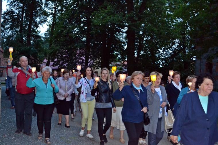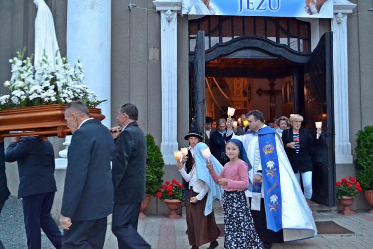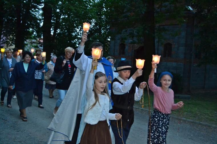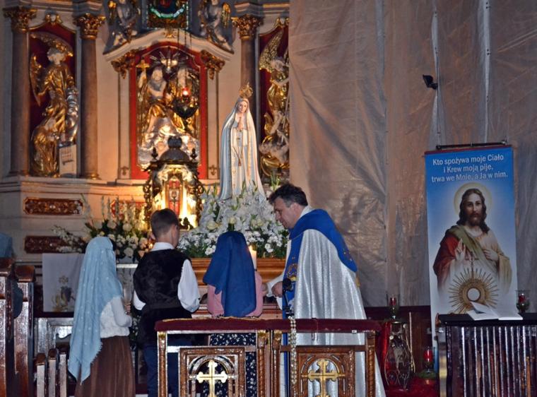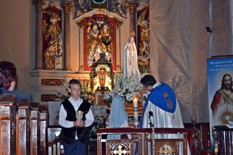 W rozważaniu poprzedzającym modlitwę różańcową ks. kan. Krzysztof przybliżył parafianom stan serc fatimskich pastuszków. Podkreślił, że byli oni posłuszni swoim rodzicom, pełni prostoty i czystości. Jak wskazał, to zapewne było powodem tego, że to właśnie im Maryja powierzyła misje zaniesienia światu swego przesłania. W dalszej części rozważania ks. kanonik przypomniał uczestnikom modlitewnego spotkania treść drugiego objawienia. Zaakcentował rolę i znaczenie ustanowienia nabożeństwa do Niepokalanego Serca Maryi. Podkreślając znaczenie wspólnoty i pracy nad sobą powiedział m.in. „ Nasza parafialna wspólnota ma również swoje serce. Ono bije w każdym z nas. Wciąż uczymy się jaką powinniśmy być wspólnotą. Zadania te wynikają z naszego chrztu. Ponieważ jednak nasza ludzka natura skłonna jest do grzechu, dlatego wciąż modlimy się , pracujemy nad sobą, aby nasze serca były podobne do Serca Pana Jezusa i Niepokalanego Serca Maryi”. Ks. kan. podkreślił, że w wielu miejscach, gdzie miały miejsce objawienia Matki Bożej gromadzą się tłumy wiernych, którzy chcą dotknąć tajemnicy Niepokalanego Serca Maryi. Kończąc rozważanie ks. kan. powiedział: „ My zgromadzeni na nabożeństwie fatimskim odmawiamy różaniec, śpiewamy pieśni maryjne, prosimy Maryję o wstawiennictwo u Trójjedynego Boga we wszystkich naszych potrzebach. Tym samym jesteśmy wspólnotą , której celem jest sam Bóg”. Po zakończeniu rozważania rozpoczęliśmy modlitwę różańcową. Przy pięknie przyozdobionej figurze Pani Fatimskiej nie mogło zabraknąć pastuszków. W ich postacie wcieliły się dzieci z naszej parafii. Ku niebu popłynęła modlitwa, o którą nieustannie prosiła i prosi Maryja… W kontemplowaniu tajemnic różańca pomocne były rozważania ks. kanonika. Przed rozpoczęciem czwartej tajemnicy ks. kan. od świecy płonącej przy figurze odpalił świece pastuszków. Ci zanieśli to światło do uczestników nabożeństwa. Po zakończonej modlitwie różańcowej wyruszyliśmy w procesji z figurą Fatimskiej Pani zapalonymi świecami wokoło kościoła. Podczas procesji rozległo się bicie dzwonów w mikstackiej świątyni. Wzywają nas one i przypominają codziennie od dnia nawiedzenia o Apelu Jasnogórskim. Gdy procesja powróciła do kościoła w duchowej łączności z Jasną Górą śpiewaliśmy: Maryjo jestem, pamiętam, czuwam! Po końcowym błogosławieństwie wierni otoczyli figurę Fatimskiej Pani i zaśpiewali pieśń „ Zapada zmrok…”. Wypowiedziane z życzliwością i uśmiechem słowa „ Dobrze, że jesteś” do osób stojących najbliżej nas uświadomiły nam, że naprawdę jesteśmy wspólnotą. I jeszcze jedna refleksja. Pięknie prezentowała się udekorowana kwiatami Fatimska Pani, ale co najważniejsze otoczona była sercami kochających Ją ludzi.