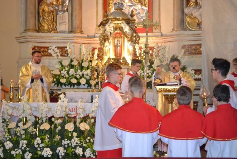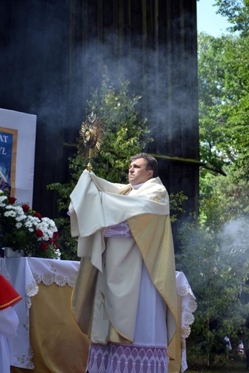 Kontynuując rozważanie ks. kan. podkreślił, że pierwszym celem liturgii jest uwielbienie Boga. Zwrócił także uwagę na zanik sacrum w życiu współczesnego człowieka, co prowadzi do tego, świat szybciej się sekularyzuje niż Kościół go ewangelizuje. Nawiązując do obchodzonego w tym roku 100- lecia objawień fatimskich ks. kan. Krzysztof powiedział: „…warto zatrzymać się nad treścią modlitwy anioła z Fatimy: „ O mój Boże, wierzę w Ciebie, uwielbiam Cię, kocham, Cię, ufam Tobie…”. W dalszej części kaznodzieja zwrócił uwagę na przywrócenie sacrum w dwóch wymiarach: doświadczenia wewnętrznego, ale także w wymiarze zewnętrznym czyli dotyczącym naszej postawy, gestów, staranności z jaką je wykonujemy. Kaznodzieja zachęcił zebranych do swoistego rachunku sumienia, do postawienia sobie osobiście pytania o to jak traktujemy Ciało Pańskie. Zapytał mi. in. o to czy przyklękamy przed tabernakulum, jak się zachowujemy, jaka przyjmujemy postawę mijając kapłana idącego z Najświętszym Sakramentem do chorych. Kontynuując pytał: Klęczysz czy kucasz? Gdzie w Piśmie Świętym jest napisane kucnij przed Panem”. Przywołał słowa św. Pawła mówiące „ Na imię Jezusa zegnie się każde kolano istot niebieskich i ziemskich i podziemnych”. Kaznodzieja zwrócił uwagę, że już podczas procesji eucharystycznej możemy zmienić swoją postawę i zgiąć kolana przed wychodzącym na nasze ulice Panem. Wiele ważnych słów padło w tej homilii. Trzeba mieć nadzieje, że pobudziły one uczestniczących w uroczystej sumie wiernych do refleksji, a w konsekwencji do podjęcia kroków mających na celu przywrócenia sacrum w naszym życiu.