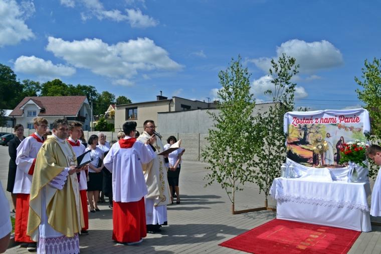 Po Mszy Świętej przed wystawionym Najświętszym Sakramentem, odmówiliśmy Litanię do Serca Jezusowego. Następnie wraz z Jezusem ukrytym pod postacią Chleba wyruszyliśmy w procesji do czterech ołtarzu. Krzyż, chorągwie, feretrony, poduszki z emblematami religijnymi niesione przez dzieci poprzedzały w procesji Jezusa ukrytego pod postacią Chleba niesionego w monstrancji. Tuż przed kapłanem niosącym monstrancje szły dziewczynki sypiące kwiatki. Pięknie przygotowane zostały ołtarze.