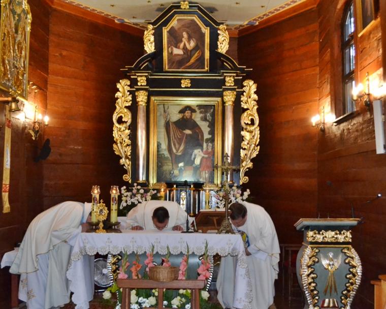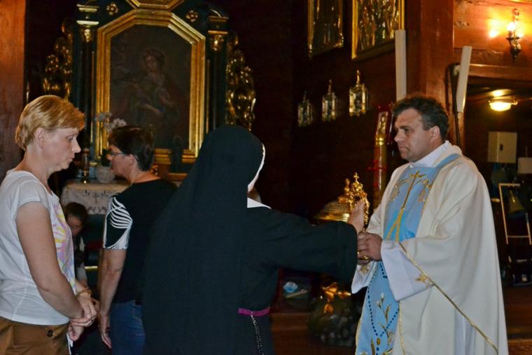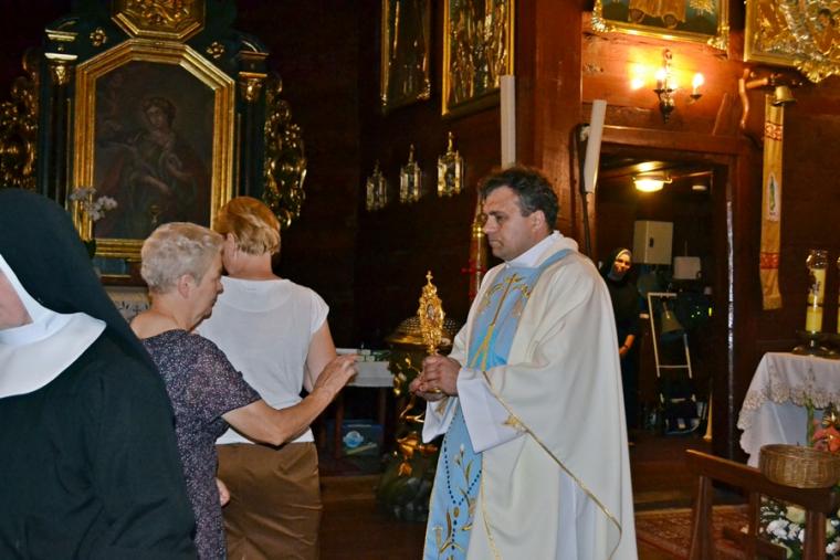 O godz. 18:30 ks. kan. Bogumił Kempa, ks. kan. Krzysztof Ordziniak, ks. Krzysztof Lipiński sprawowali w sanktuarium Eucharystię połączoną z Nowenną. Zgromadzeni wierni mogli wysłuchać piątej już nauki rekolekcyjnej, która wygłosił ks. kan. Bogumił. Na początku kaznodzieja zwrócił naszą uwagą na fakt, że w tym nowennowym czasie Kościół wspomina każdego dnia postacie Świętych. Podkreślił, że są to postacie, które patrząc po ludzku nie dokonały niczego nadzwyczajnego, ale zostały wybrane przez Pana Boga. Jak podkreślił kaznodzieja, były to osoby żyjące Ewangelią, które nie bały się wziąć krzyża, nie bały się zaprzeć samych siebie. Zwrócił uwagę, że człowiekowi wydaje się, że wiara ma nam zagwarantować nam życie łatwe, miłe, przyjemne. Jezus nigdy nam takiego życia nie obiecywał. Taka postawa wobec wiary, wobec Boga może prowadzić do jej utraty, odrzucenia w chwilach trudnych doświadczeń. O powołaniu do świętości mówił dalej ks. kan. Bogumił: „ Świętość osiąga się wtedy kiedy bierze się krzyż. Jezus nigdy nie mówił, że świętym zostanie człowiek, którego życie będzie miłe, łatwe, przyjemne, który będzie codziennie doświadczał Bożego błogosławieństwa- Jeśli kto chce iść za mną, niech się zaprze samego siebie, niech weźmie swój krzyż i niech Mnie naśladuje. Wybranie przez Chrystusa zawsze łączy się z krzyżem. Kaznodzieja przybliżył postać św. Klary, akcentując, że dla niej, podobnie jak i dla św. Rocha Chrystus był kimś autentycznym, kimś dla kogo zaparli się samych siebie, dla kogo brali swój krzyż.