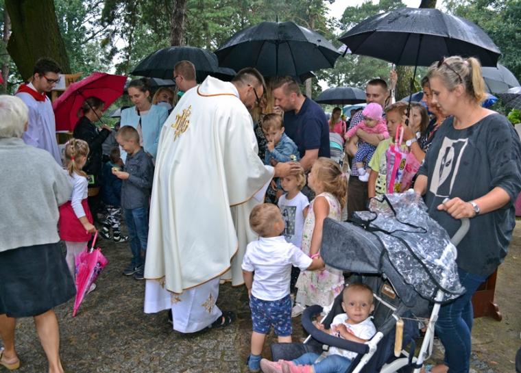 Czas wielkiego świętowania rozpoczął się procesją z Najświętszym Sakramentem i relikwiami Świętego Rocha z kościoła farnego do sanktuarium, zakończył jej powrotem. Zanim procesja z Najświętszym Sakramentem wyruszyła z sanktuarium do fary wyjątkowo gwarno zrobiło się wokół niego. W dniu uroczystości odpustowych przybyły wraz ze swoimi rodzicami do św. Rocha dzieci. Tu o godz. 18:00 ks. kan. Bogumił Kempa sprawował w ich intencji Mszę święta oraz skierował do wiernych rozważanie. Krótko po rozpoczęciu Eucharystii zaczął padać deszcz. Ksiądz Bogumił zaprosił dzieci, by zgromadziły się przy ołtarzu, bo zostało nad nim przygotowane zadaszenie. Na początku homilii kaznodzieja powiedział, że pierwszy raz głosi ją w takim towarzystwie. Wyraził radość z obecności tak wielu dzieci w sanktuarium u św. Rocha. Podkreślił, że dzieci przybyły tu po błogosławieństwo, które czyni człowieka szczęśliwym. Wyjaśniając istotę błogosławieństwa powiedział: „ Jeżeli błogosławię, to znaczy życzę komuś dobrze, życzę mu szczęścia. Przyszły tutaj te dzieci, aby mogły dostać Boże szczęście, dlatego tak ważna drodzy rodzice jest wasza obecność tutaj”. O tym jak ważne jest to, by rodzice błogosławili swoje dzieci mówił kaznodzieja w dalszej części rozważania. Zachęcał, by rodzice jak najczęściej błogosławili swoje dzieci. Dając świadectwo powiedział, że jego rodzice nadal błogosławią go, gdy wraca do domu, bądź z niego wyjeżdża. Stwierdził, że ważne jest to błogosławieństwo, bo uświadamia nam, że tylko Chrystus może dać nam prawdziwe szczęście. Nawiązując do postaci św. Rocha powiedział: „ Ten nasz wspaniały Patron, którego czcimy już od tylu dni jest tego dowodem. Ten człowiek doświadczył i cierpienia i złośliwości, doświadczył uwięzienia, doświadczył choroby. Doświadczył tego, że tak wielu ludzi się od niego odwróciło. A jednak jest błogosławiony, jest szczęśliwy”. W dalszej części rozważania ks. Bogumił zachęcał i prosił rodziców,aby uczestniczyli z dziećmi we Mszy św. i pokazywali im jak jest ona ważna. Podkreślił ponadto znaczenie przykładu rodziców i zachęcał, by klękali do modlitwy i uczyli jej swoje dzieci. Kończąc homilię kaznodzieja powiedział: „ Niech Boże błogosławieństwo z tego miejsca, z tego sanktuarium spływa na was, na wasze rodziny, na wszystkie dzieci, także na te nienarodzone, bo widzę że i takie też tu są. Niech Pan Bóg wam wszystkim błogosławi”. Została odmówiona specjalna modlitwa, a następnie kapłani udzielali dzieciom indywidualnego błogosławieństwa. Na pamiątkę spotkania u św. Rocha dzieci otrzymały obrazki. Były też i dla nich słodycze.