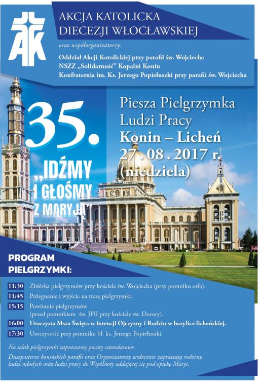 Organizatorami XXXV Pieszej Pielgrzymki Ludzi Pracy z Konina do Lichenia jest koniński oddział Akcji Katolickiej, Konfraternia im. ks. Jerzego Popiełuszki działające przy parafii pw. św. Wojciecha w Koninie oraz NSZZ „Solidarność” KWB Konin.
