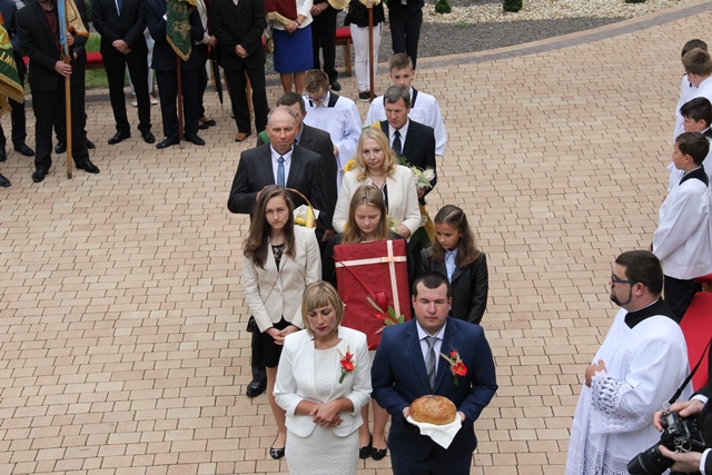 Po Eucharystii starostowie dożynek Beata Budzik z Boczkowa i Sławomir Wawrzyńczak ze Skalmierzyc złożyli bochen chleba na ręce biskupa kaliskiego Edwarda Janiaka, burmistrz Nowych Skalmierzyc Bożeny Budzik i przewodniczącego rady miasta i gminy Nowe Skalmierzyce Kazimierza Sipki.