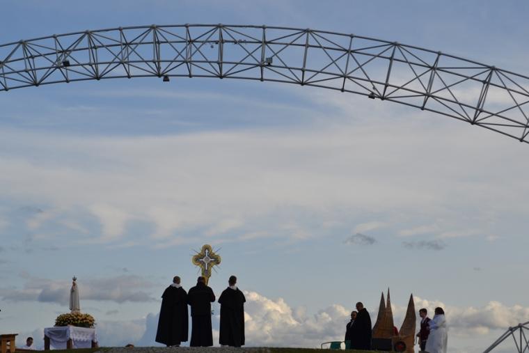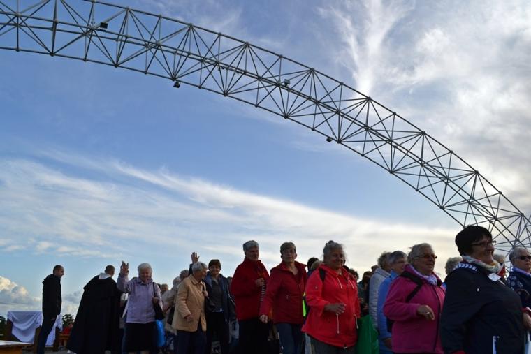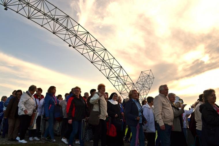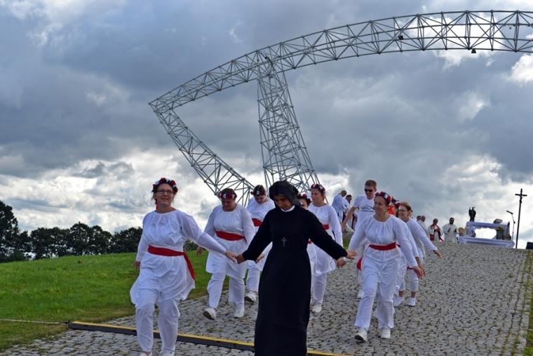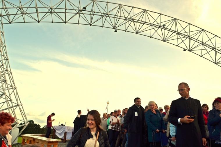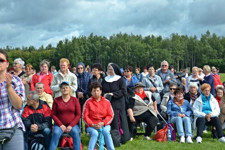 O godz. 12:45 rozpoczęła się Eucharystia, której przewodniczył ks. bp Michał Janocha, który także wygłosił homilię. Podkreślił w niej, że poprzez chrzest staliśmy się ludźmi wolnymi. Nawiązując do symboliki wagi, że gdy jej szale znajdują się na jednakowym poziomie wszystko w życiu może się wydarzyć. Od decyzji człowieka, od jego wyborów zależy w którą stronę przechyla się jej szale. Ks. biskup podkreślił, że człowiek stawiany jest nieustannie w sytuacjach wyboru miedzy prawdziwym dobrem, dobrem pozornym, które często podawane jest człowiekowi w pięknym opakowaniu. W dalszej części homilii ks. bp rozważał znaczenie trzech słów: rozwaga, uwaga, odwaga, podkreślając ich znaczenie w kontekście rozwoju duchowego człowieka. Ks. Biskup podkreślił, że człowiek współczesny ma wiele problemów ze skupieniem uwagi na tym, Który jest w życiu najważniejszy. Przywołał przykład Matki Teresy z Kalkuty, która potrafiła skoncentrować swoją uwagę na tym co działo się w jej życiu w konkretnym momencie. Podkreślił, że na tym właśnie polega „ tajemnica świętości”. Ks. biskup zachęcał zebranych, rozwagę, uwagę i odwagę prosili Matkę Bożą. Po Eucharystii był czas na posiłek i chwilę odpoczynku. W godzinie miłosierdzia odśpiewana została Koronka do Miłosierdzia Bożego. W popołudniowej części spotkania Lednicy Seniora uczestniczył Prymas Polski abp Wojciech Polak. Podczas odprawiania Koronki młodzież wniosła obraz Jezusa Miłosiernego. Następnie zostały zaprezentowane dwie inscenizacje biblijne: „Rola Maryi – Maryja wyprowadza nas z ukrycia” oraz „Ty jesteś Zacheuszem – Pragnij i zaryzykuj”. Siostry zakonne w geście rozesłania wykonując na czole uczestników spotkania znak krzyż wypowiadały słowa: Idź i kochaj. Podczas modlitewnego spotkania pod Bramę III Tysiąclecia została przyniesiona figura Matki Bożej Fatimskiej, obraz Czarnej Madonny oraz pusta rama. Podczas wprowadzania figury i obrazu ku niebu popłynęła modlitwa różańcowa. Na Legnickie Pola przybyli także przedstawiciele Wspólnoty Betlejem. Złożone przez nich świadectwa nawrócenia i spotkania z Jezusem zrobiły na zebranych wielki wrażenie.