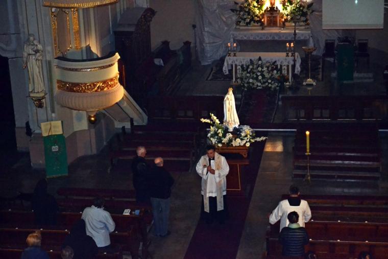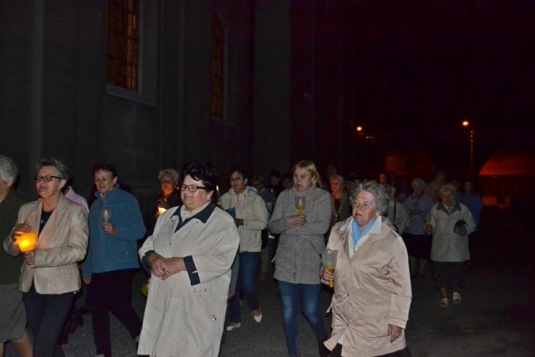 Kolejne postanowienia dotyczyły codziennej modlitwy do Ducha Świętego, a także obrania Maryi za Królową naszych serc. Podczas odmawiania piątej tajemnicy w świątyni zapłonęły lampiony przyniesione przez wiernych. Zostały one zapalone od świecy jubileuszowej stojącej przy figurze Fatimskiej Pani. Następnie odmówiliśmy modlitwę Anioła i ze śpiewem na ustach z zapalonymi lampionami wyruszyliśmy figurą Fatimskiej Pani z procesją wokoło kościoła. W tym czasie rozległ się dźwięk dzwonów, który przypomina nam o tym, by stanąć do Apelu Jasnogórskiego. Towarzyszy nam on od czasu nawiedzenia naszej parafii przez Czarną Madonnę w 2011 roku. Po powrocie do kościoła został odśpiewany Apel Jasnogórski . Maryjo: jesteśmy, pamiętamy, czuwamy- to wyznanie popłynęło ku niebu z naszego parafialnego wieczernika. Modlitwą w ten wieczór objęliśmy także zgromadzonych w polskiej Fatimie na zakopiańskich Krzeptówkach Kustoszy Sanktuariów i uczestników Międzynarodowego Kongresu Maryjno- Mariologicznego.