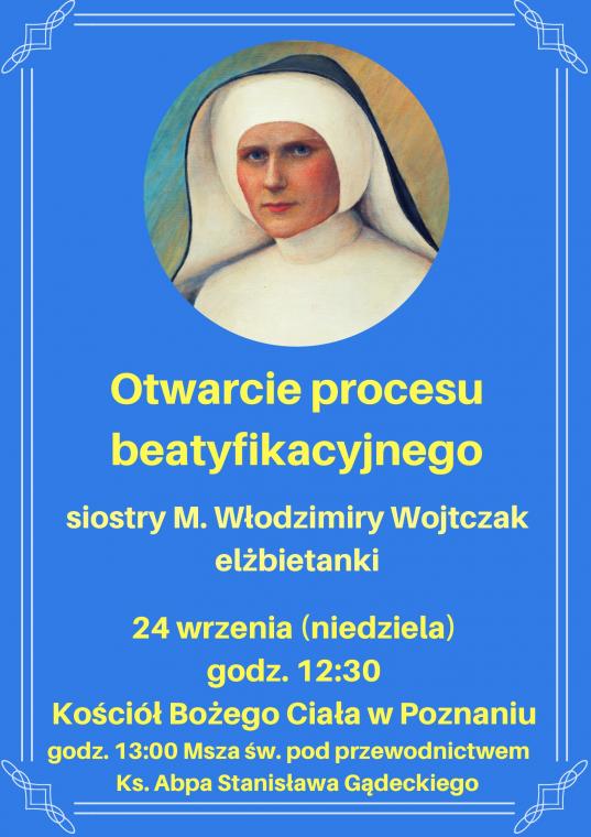 W najbliższą niedzielę, 24 września 2017 w kościele pw. Bożego Ciała w Poznaniu godz. 12:30 pierwsza sesja otwarcia procesu beatyfikacyjnego Siostry M. Włodzimiry Wojtczak na szczeblu diecezjalnym, po niej Msza św. pod przewodnictwem Ks. Abpa Stanisława Gądeckiego.