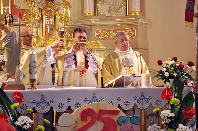 Małe i wielkie jubileusze są okazją do dziękczynienia, ale i radosnych spotkań. Taki piękny Jubileusz 25-lecia Kapłaństwa obchodził, posługujący od ponad czternastu lat w mikstackiej parafii ks. proboszcz Krzysztof Ordziniak, który jednocześnie jest kustoszem Diecezjalnego Sanktuarium Świętego Rocha. W niedzielne przedpołudnie o godz. 11:00 w kościele farnym sprawowana była Jubileuszowa Msza Święta, na którą ks. kanonik zaprosił wszystkich parafian. Przed uroczystościami wręczył każdej rodzinie zaproszenie na wspólną modlitwę, a po niej biesiadowanie w parku. Podczas Mszy Świętej Jubilat dziękował za wszystkie otrzymane łaski, za dar powołania, za osoby, które były, są i będą przy nim na drodze kapłańskiej posługi.