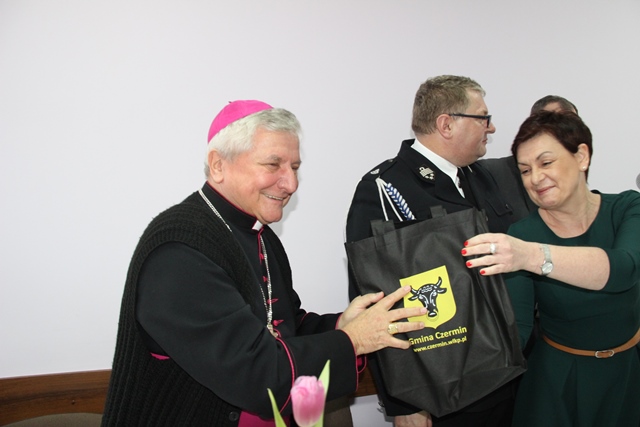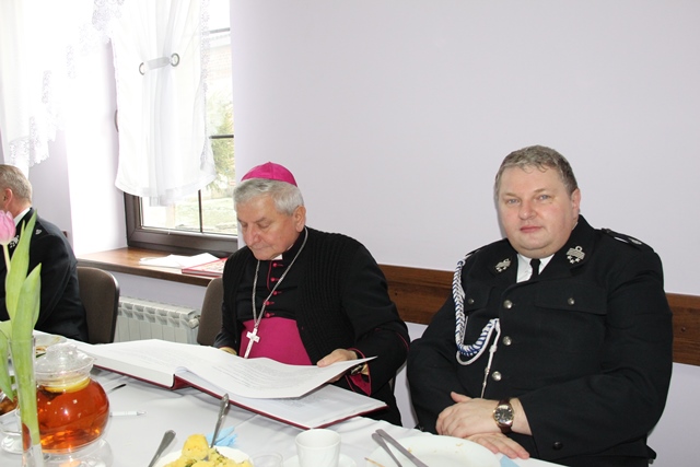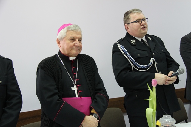 Biskupowi kaliskiemu Edwardowi Janiakowi podziękował za przewodniczenie w ubiegłym roku Mszy św. z okazji wielkopolskich wojewódzkich obchodów Dnia Strażaka w Krotoszynie i poświęcenie 41 nowych wozów strażackich, a także za życzliwość okazywaną strażakom.