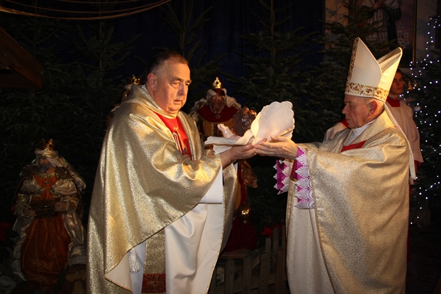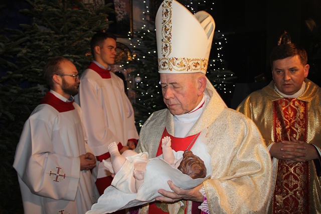 Przed rozpoczęciem Eucharystii w procesji bp Stanisław Napierała zaniósł figurkę Dzieciątka do żłóbka.