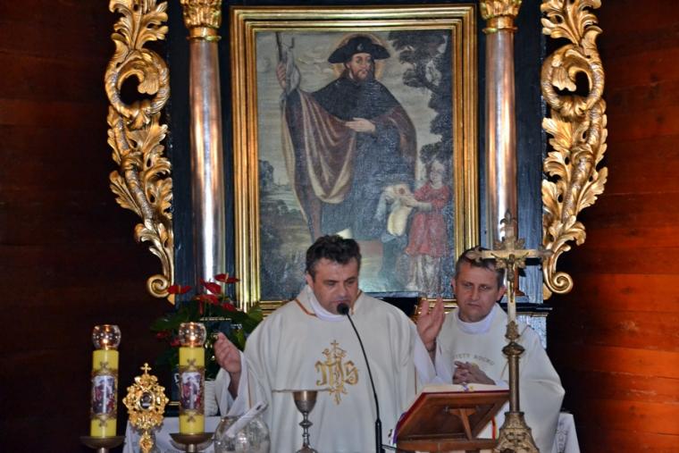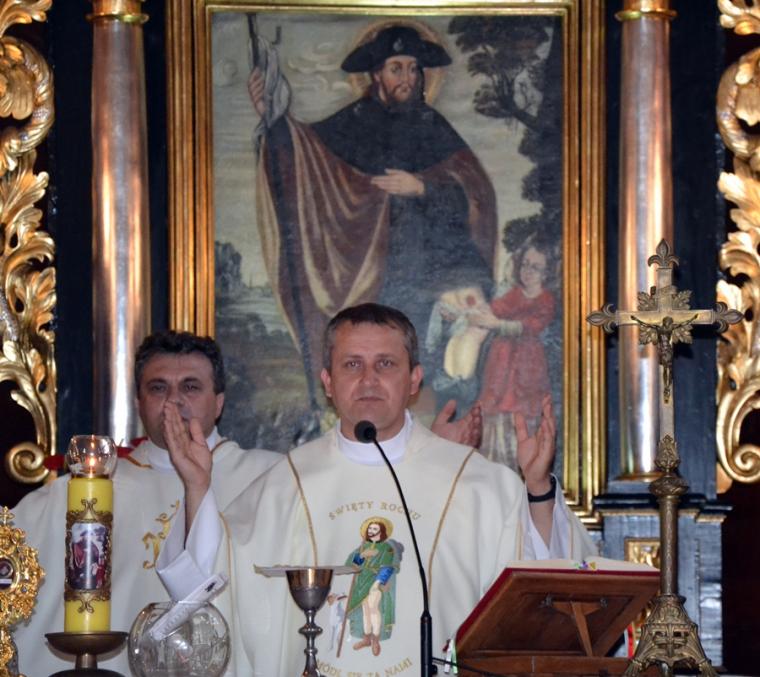 Dorośli parafianie i pielgrzymi przygotowują się do uroczystości odpustowych poprzez udział w mszach św. podczas których, głoszone są nauki. W tym roku głosi je ks. Sebastian Łagódka. W drugim dniu przygotowań duchowych do uroczystości odpustowych o godz. 18:00 odmówiony został różaniec. Dlaczego właśnie to modlitwa? Bo nasz niebieski patron był wielkim czcicielem Matki Bożej, a na naszym obrazie przedstawiony jest z różańcem zwisającym u pasa. Po różańcu odśpiewane zostały Godzinki o świętym Rochu Wyznawcy. O godz. 18:30 rozpoczęła się Eucharystia, której przewodniczył ks. Sebastian Łagódka, zaś współcelebransem był ks. kan. Krzysztof Ordziniak. Podczas tej mszy świętej wierni wysłuchali kolejnej konferencji. Przypomnijmy, w pierwszej ksiądz rekolekcjonista skoncentrował uwagę na chrzcie, który jest punktem wyjścia naszej wiary, zanurza nas w łasce Bożej. Zachęcał, byśmy rozbudzili w sobie pragnienia całkowitego zanurzenia naszego życia w Bogu. Ksiądz Sebastian zwrócił uwagę, że istnieje niebezpieczeństwo, że zamiast zanurzyć się w Bogu, przyjąć to co daje on nam każdego dnia, próbujemy stawia warunki. Podkreślił, że w dniu chrztu zostaliśmy naznaczeni znakiem krzyża, znak błogosławieństwa. To właśnie znak krzyża stał się myślą przewodnią czwartkowej konferencji. Kontynuując kaznodzieja nawiązał do znaku krzyża, którym naznaczony był święty Roch. Podkreślił, że krzyż był mocno obecny w jego życiu, także w postaci cierpienia. Kontynuując kapłan powiedział: „ Zostaliśmy naznaczeni krzyżem to znaczy, że nasza wiara nie może nigdy wyrzec się krzyża i nie może uciekać od krzyża”. Dzieląc się swoim spostrzeżeniem z kapłańskiej posługi zaakcentował, że ludzie czasami ulegają pokusie chrześcijaństwa bez krzyża. Polega ona na myśleniu, że jeśli będziemy chodzić do kościoła, modlić się, spowiadać regularnie to ominą nas w życiu wszystkie trudności. Gdy te trudności się pojawiają człowiek zaczyna robić Bogu wyrzuty, stawiać Bogu pytanie: dlaczego mi to robisz? Jest to efektem niewłaściwego pojmowania wiary. Nawiązując do słów Ewangelii podkreślił, że uczniowie Jezusa usłyszeli słowa o czekającym cierpieniu, ale nie usłyszeli o tym, że zmartwychwstanie. Kaznodzieja wskazał, że Jezus mówił o tym, że na drodze wiary jest krzyż. Zaakcentował, że nam potrzebny jest krzyż. Ksiądz Sebastian przywołał słowa papieża Franciszka: „Nie chciejcie Chrystusa bez krzyża. Chrystus bez krzyża nie jest zbawicielem jest tylko nauczycielem, jest tylko człowiekiem z dobrą prawdą”. Kontynuując ksiądz rekolekcjonista podkreślił, że Zbawicielem jest ten, który umiera na krzyżu i zmartwychwstaje. Zaznaczył, że krzyż bez Chrystusa jest czymś co nas przygniata. W dalszej części konferencji ks. Sebastian zaznaczył, że człowieka prędzej czy później doświadczy krzyża. Zwrócił uwagę, że gdy chcemy zrobić coś dobrego, wymaga to od nas wysiłku, trudu, czynienie zła przychodzi nam znacznie łatwiej. Podkreślił, że cierpienie, śmierć są efektem zawiści diabła.