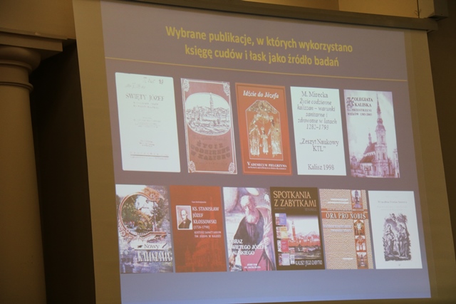 Prezentację ubogacił wykład dr Ewy Andrzejewskiej nt. „Kaliska księga cudów i łask jako źródło badań historycznych”. Prelegentka w bardzo ciekawy sposób ukazała zawartość książki. Mówiła m.in. o wotach składanych św. Józefowi w podziękowaniu za uzyskane łaski.