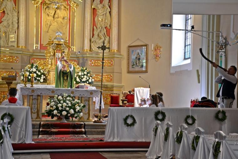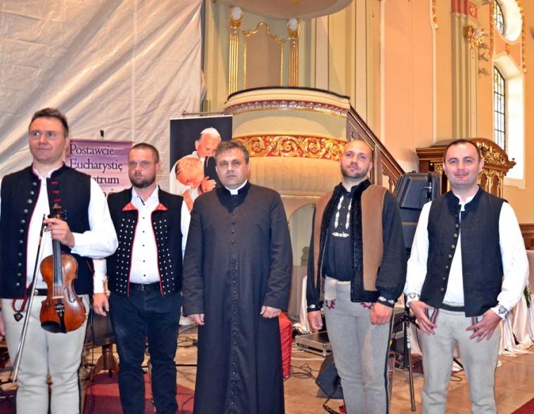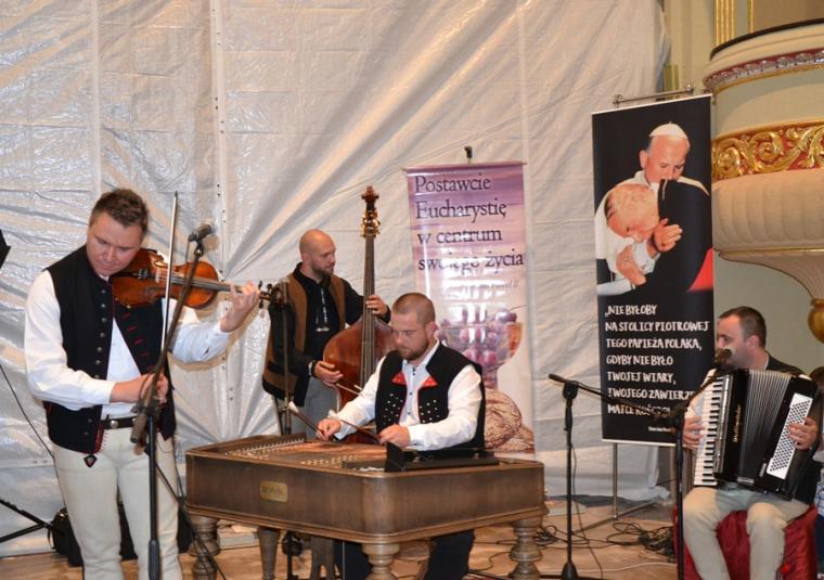 W niedzielne przedpołudnie mieliśmy okazję uczestniczyć w jednym z nich zatytułowanym „ Nuty góralskie o św. Janie Pawle II”. Poprzedziła go Eucharystia, którą w sposób aktywny włączyli się członkowie Kapeli „Góralska Hora”. Mieliśmy okazję wysłuchać czytań, które tym razem wybrzmiały w naszym kościele w gwarze góralskiej. Odśpiewany psalm, był próbką uczty duchowej, która czekała nas po Eucharystii. Także podczas Przeistoczenia, tym razem, nie rozległ się głos dzwonków, ale rogu pasterskiego.