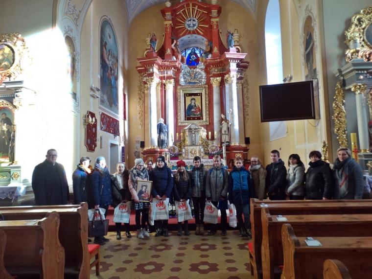 Następnie uczestnicy konkursu wraz z opiekunami udali się do sanktuarium Matki Bożej Pocieszenia. Tu jego kustosz, ks. kanonik Łukasz Żurawski zapoznał wyjątkowych pielgrzymów z historią sanktuarium oraz opowiedział o obrazach i figurach świętych, znajdują się w ołtarzu głównym i ołtarzach bocznych świątyni. Ksiądz kustosz wręczył nagrodę specjalną Aleksandrze Frala- obraz Matki Bożej Pocieszenia. Aleksandra zdobyła największą ilości punktów w części konkursowej dotyczącej Sanktuarium Matki Bożej Pocieszenia w Lutogniewie. Zorganizowany konkurs to ciekawa inicjatywa, która zmotywowała uczestników do pogłębienia wiedzy o miejscowym sanktuarium, a także o sanktuarium w Gietrzwałdzie w 140. rocznicę objawień. Organizatorem konkursu była katechetka Agata Hadryś.
