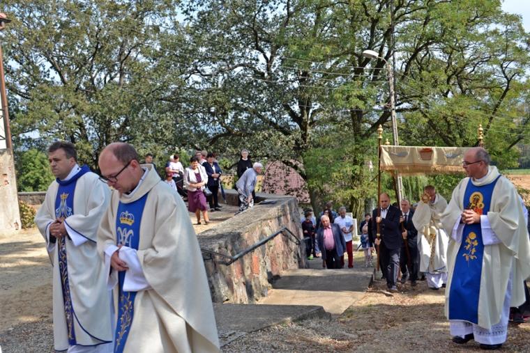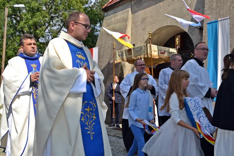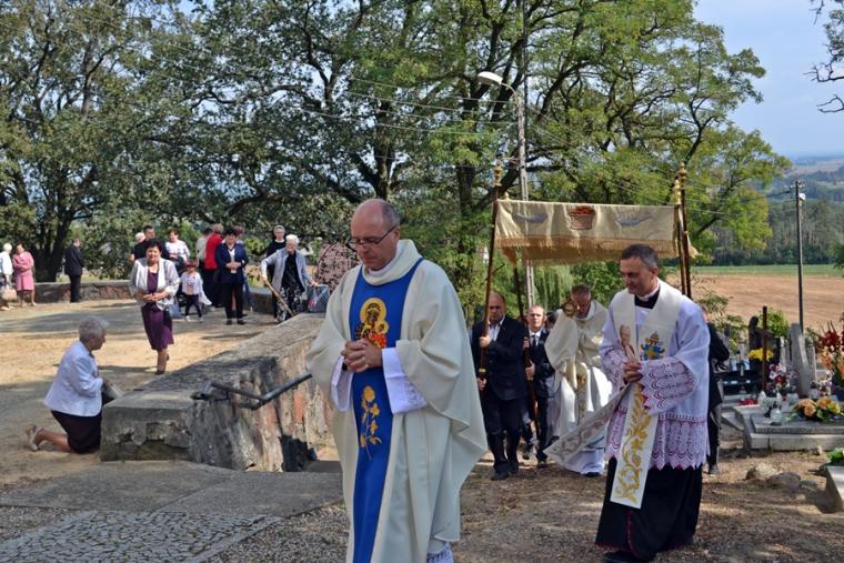 Kończąc kaznodzieja powiedział: „ Rozważając rodowód Jezusa Chrystusa nie zamartwiajmy się zbytnio, że jesteśmy, słabi, grzeszni. Jeśli przychodzimy do Chrystusa Pana i Jego Matki On z nami zrobi wielkie rzeczy. Bóg z tymi, którzy Go miłują współdziała we wszystkim. Amen”. Wiele ważnych słów wybrzmiało w homilii ks. kan. Jacka warto do nich powracać, uczynić je przedmiotem głębszej refleksji, a także rachunku sumienia. Po Mszy Świętej główny celebrans pobłogosławił ziarna zbóż. Następnie przy wystawionym Najświętszym Sakramencie odmówiona została Litania do Matki Bożej i procesja Eucharystyczna wyruszyła ścieżkami wiodącymi wśród grobów tych, którzy kiedyś oddawali cześć Matce Boskiej Kotłowskiej. Po końcowym błogosławieństwie odśpiewana została pieśń „ Boże coś Polskę”. Piękny jest ten odpustowy czas, dobrze spędzać go u stóp Matki Bożej Kotłowskiej, która z takim zatroskaniem spogląda na swe dzieci z ukoronowanego wizerunku.