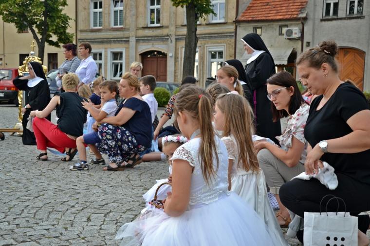Po Mszy Świętej udaliśmy się w procesji na Rynek pod figurę Najświętszego Serca Jezusowego. Tu została odmówieniu Litania do Najświętszego Serca Pana Jezusa. Następnie ks. proboszcz odczytał Aktu poświęcenia miasta NSPJ, ten sam, który wybrzmiał na mikstackim rynku w 1936 roku. Tak jak przed laty popłynęły ku niebu słowa: „Przychodzimy więc dzisiaj, by uznać całkowite panowanie Twoje nad miastem naszem. (...). Panuj więc nad naszym rozumem przez prostotę wiary, panuj też przez swa miłość nad sercami naszemi, które niech całkowicie nią zapłoną. Chcemy je w Twej żarliwej miłości utrzymać przez częste przyjmowanie Komunii św. Racz, Boskie Serce, (...) błogosław nasze duchowne i doczesne przedsięwzięcia, rozpraszaj nasze troski, uświęcaj nasze pociechy i łagódź nasze cierpienia”. Po odnowieniu aktu ks. kan. Krzysztof udzielił błogosławieństwa Najświętszym Sakramentem na cztery strony świata.