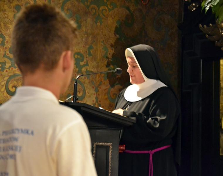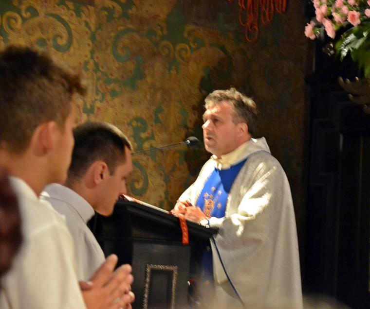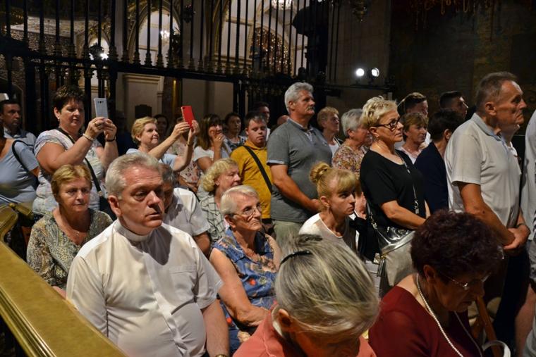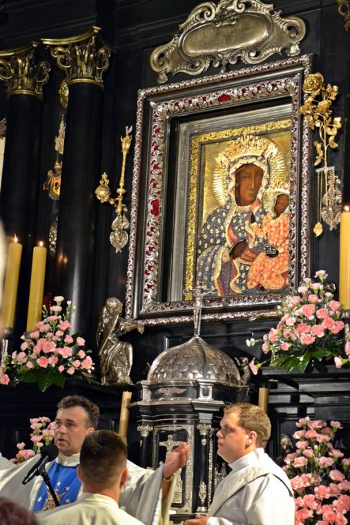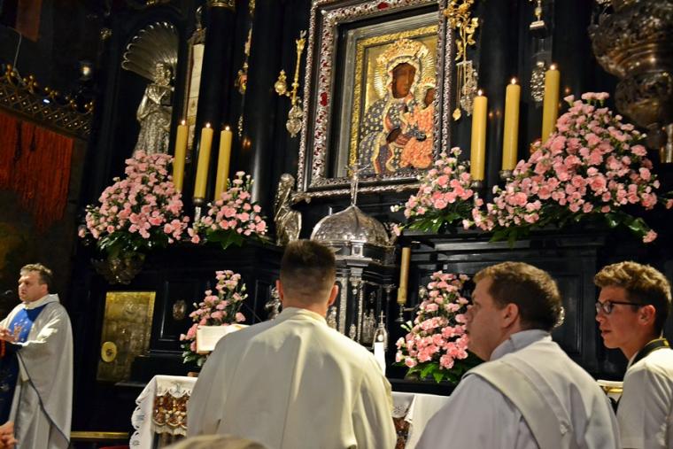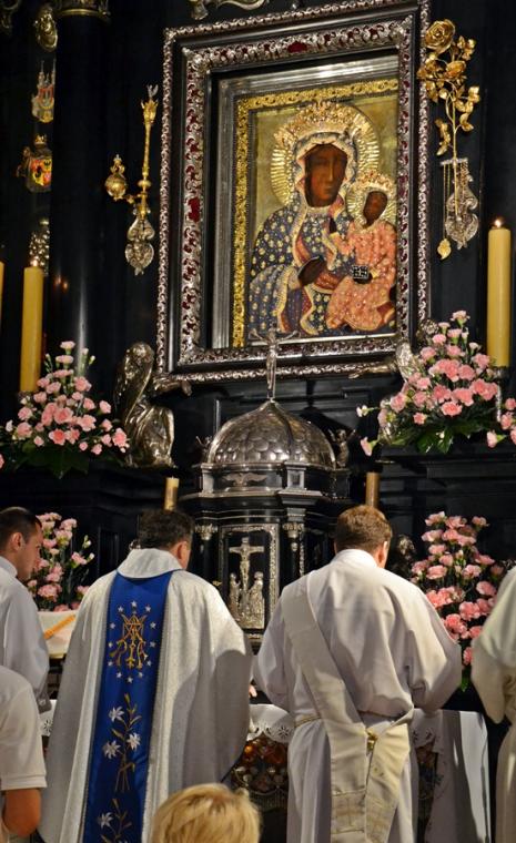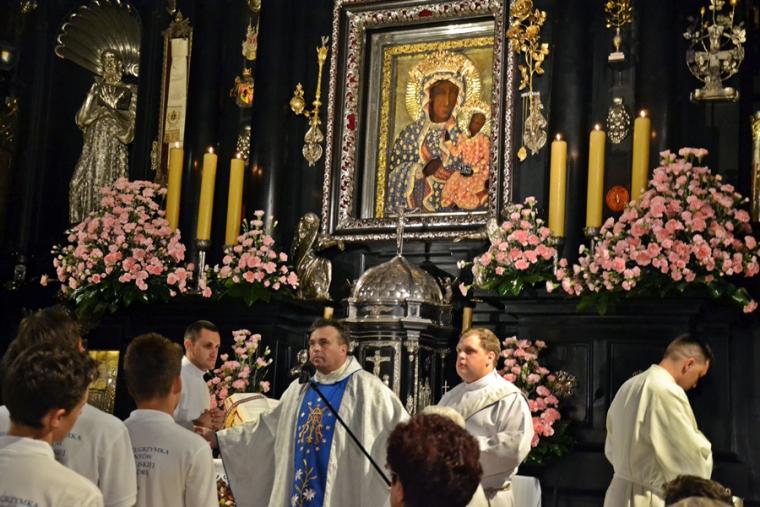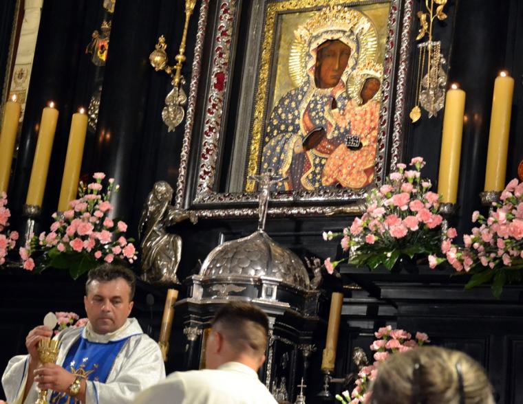 O godz.19:30 przeżywaliśmy w Kaplicy Cudownego Obrazu Eucharystię podczas której ks. kan. Krzysztof powierzał Pani Jasnogórskiej wszystkie nasze intencje. To właśnie ks. proboszcz przewodniczył tej mszy świętej, a jednym ze współcelebransów był kapłan posługujący w naszej kaliskiej diecezji ks. Jarosław Kołodziejczak. Wraz z nami modlili się m.in. uczestnicy I Biegowej Pielgrzymki Ministrantów Diecezji Kaliskiej. Wielu  z nas pierwszy raz miało okazję przeżywać Eucharystię w takiej bliskości Cudownego Obrazu Jasnogórskiej Pani. Była więc okazja, by  z bliska dostrzec pełne miłości, ale i zatroskania oczy Matki. Homilię podczas tej mszy św. wygłosił ks. Jarosław.  Podkreślił, że przybywając na Jasną Górę pierwsze kroki kierujemy do Kaplicy Cudownego Obrazu Czarnej |Madonny, by spojrzeć w oczy Matki i by Ona spojrzała na nas. Towarzyszy  nam  w tych chwilach modlitwa. Kaznodzieja pytał zgromadzonych, czy pamiętają o czym najpierw powiedzieli Maryi. Kontynuując dodał, że zapewne o tym co dla każdego jest  najcenniejsze, najważniejsze. Podkreślił, że Matka jest tą, która wysłucha, przytuli, zrozumie. W dalszej części kaznodzieja zwrócił uwagę, że wracając do codzienności  nie przychodzimy do Kaplicy nie po to, by się z Maryją pożegnać, ale by zabrać Ją ze sobą, zaprosić Ją do naszego życia, tak jak uczynili to młodzi  na weselu w Kanie Galilejskiej. Kontynuując kaznodzieja podkreślił, że Maryja jest tą dla nas tą, która podobnie jak podczas wesela w Kanie Galilejskiej dostrzega czego nam  w życiu brakuje i prosi swego Syna, by zaradził brakom. Nawiązując do słów Ewangelii podkreślił słowa Maryi: „Zróbcie wszystko cokolwiek wam powie mój Syn”. Słudzy wypełnili do końca wolę Boga. Kaznodzieja zaakcentował, że to właśnie wtedy  dokonał się cud. Akcentując, że Jezusa przemienił zwykłą wodę w wino. Zaznaczył, że woda jest czymś zwykłym, normalnym jak życie ludzkie. Ważne jest, by nasze życie zostało ubogacone łaską Bożą, by miało swój sens. W dalszej części rozważenia ks. Jarosław podkreślił, że przychodzimy do Maryi, by oddać jej  całe nasze życie, zarówno troski, cierpienia, ale i radości, aby wyprosiła dla nas u Syna swego potrzebne nam  łaski. Kaznodzieja apelował do pielgrzymów, by nie bali się powierzyć Maryi  najbardziej skrywanych tajemnic, gdyż jak podkreślił, jeśli uczynimy to z ufnością i posłuszeństwem Jezusowi Chrystusowi to w naszym życiu będą się działy cuda. W dalszej części zwrócił uwagę  na rolę słowa Bożego w  życia. Kończąc ks. Jarosław powiedział:  "Życzę wam, by to życie od tego momentu  było już nowym życiem, życiem słuchania, życiem modlitwy, życiem przemienionym, przez Jezusa Chrystusa, który jest naszym Panem. Dzisiaj obierzmy go jako Tego, który do nas mówi, a my jesteśmy jego wiernymi sługami. Amen”. Dziękujemy ks. Jarosławowi za ubogacenia nas swoim słowem, za zwrócenie uwagi na potrzebę zaufania i słuchania, pełnienia woli Bożej. Za słowa zachęty, byśmy trudne sprawy naszego życia dzieli z naszą najlepszą Matką. W tej wyjątkowej bliskości z Matką,  jakiej dane nam było przeżywać tę Eucharystię szczególnego znaczenia nabierały słowa pieśni: „To Matka ukoić może twe serce, przytulić tak mocno jak tuli Jezusa…”.