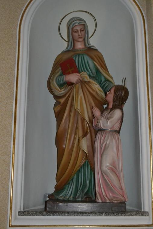 Następnie udaliśmy się na Górę Świętej Anny. Czekała tam na nas Babcia Jezusa, jej córka Maryja i Boski wnuk Jezus. Chociaż właściwie powinniśmy wymienić ich w odwrotnej kolejności, bo Anna Samotrzecia w swojej figurze pokazuje nam właśnie na Jezusa i Maryję. Ona sama stoi tuż za nimi. Po przybyciu na Górę Świętej Anny udaliśmy się do bazyliki. Stąd po przywitaniu i modlitwie udaliśmy się do Groty Lourdzkiej. Był czas na nawiedzenie kapliczek kalwaryjskich i indywidualną modlitwę w bazylice. Każdy z nas wyruszał na pielgrzymi szlak chcąc przedstawić przez wstawiennictwo świętych Bogu swoje intencje. Ważny był zatem ten czas na indywidualną modlitwę. O godzinie 14:30 w bazylice św. Anny przeżywaliśmy najważniejsze wydarzenie pielgrzymkowego dnia- Eucharystię. Sprawował ją we wszystkich naszych intencjach ks. proboszcz Krzysztof Ordziniak. Rozpoczynając mszę świętą podkreślił, że przybyliśmy na tę Górę, by uczcić świętą Annę matkę Maryi i babcię Jezusa, by jej powierzyć nasze radości i troski. W rozważaniu ks. kan. Krzysztof przypomniał, że pielgrzymowaliśmy do trzech Świętych. Nasz pielgrzymi szlak rozpoczęliśmy od Dobrzenia i spotkania ze św. Rochem, który patronuje naszemu miastu, następnie był Kamień Śląski i spotkanie ze św. Jackiem. Wreszcie dotarliśmy na Górę Świętej Anny. Podkreślił, że chronologicznie trasa naszego pielgrzymowania powinna rozpocząć się na Górze Świętej Anny. Zaznaczył, że Biblia nie przekazuje nam informacji o Annie i Joachimie, ale wiadomo, że długo oczekiwali na Maryję. Zwrócił uwagę, że podobnie było w życiu rodziców naszego niebieskiego Patrona, którzy uprosili sobie potomka właśnie za wstawiennictwem Maryi. Kontynuując ks. kanonik zaakcentował, że rodzice Maryi musieli być ludźmi świętymi, skoro przekazali życie tej, która zrodziła Zbawiciela. Podkreślił, że Maryja była służebnicą Pańską, tą, która potrafiła bezgranicznie zaufać Bogu. Zapewne tego zaufania uczyła się w domu, od swoich rodziców. Kaznodzieja zwrócił uwagę, że św. Anna jest tą, która uczy nas zaufania. Zachęcił, byśmy będąc w tym szczególnym miejscu prosili o umiejętność zaufania Bogu. W dalszej części rozważania ks. kan. Krzysztof prosił św. Annę, by w sposób szczególny wspierała tych, którzy są babciami i dziadkami, od których wiele zależy. Podkreślił jednocześnie, że ich rola we współczesnym świecie jest trudna, gdyż młodzi nie zawsze chcą przyjmować ich wskazania. Celebrans zwrócił uwagę na znaczenie modlitwy. Kończąc przywołał słowa pieśni śpiewanej często w sanktuarium: „Niech się co chce ze mną dzieje, w Tobie święta Anno, mam nadzieję”. Są one, jak podkreślił, wyrazem naszego zaufania do św. Anny. Przed końcowym błogosławieństwem ks. kan. Krzysztof odmówił modlitwę pielgrzyma przez wstawiennictwo św. Anny.