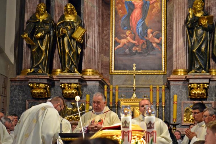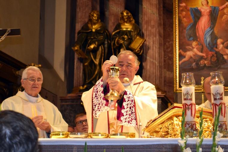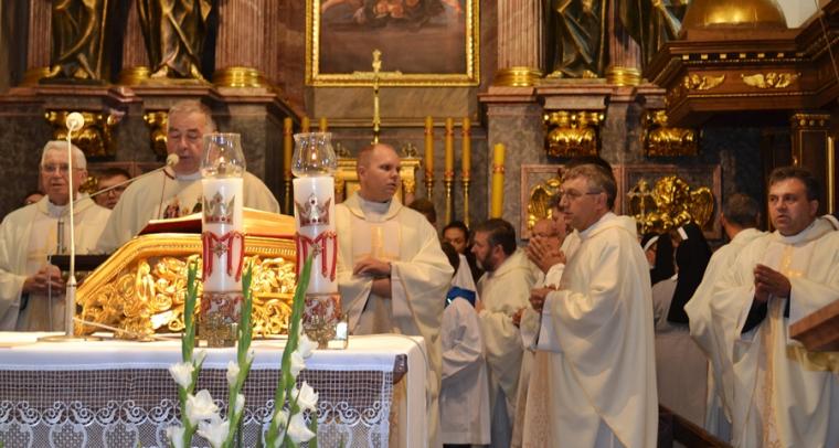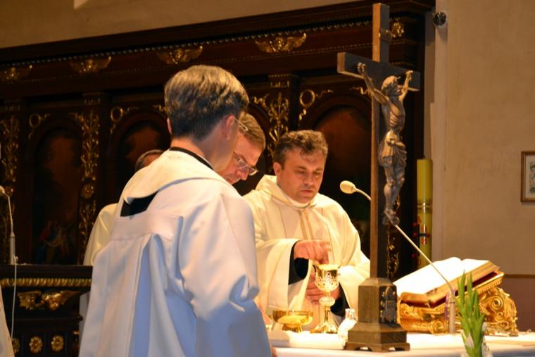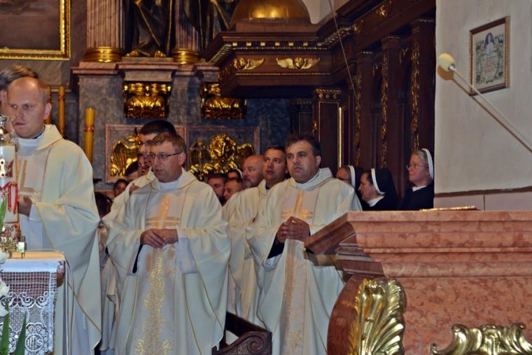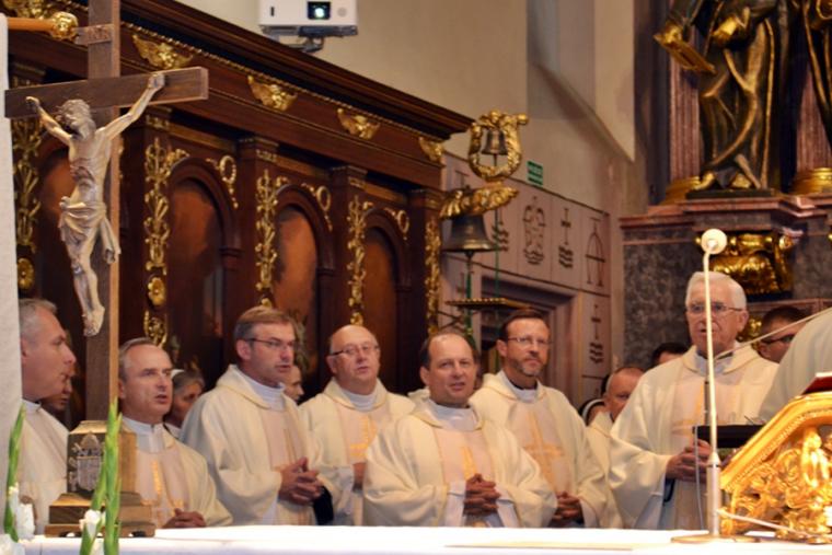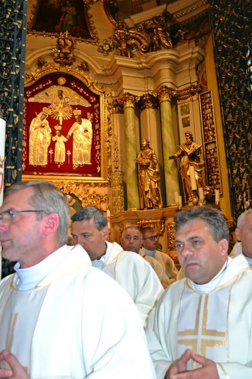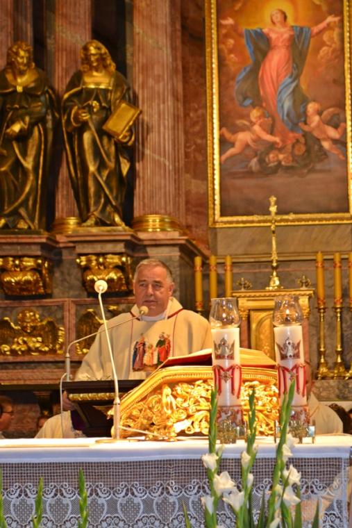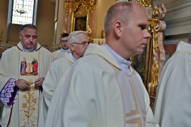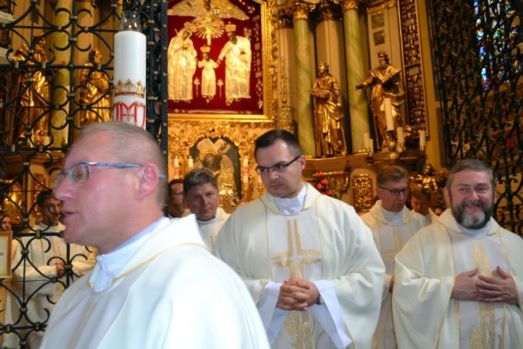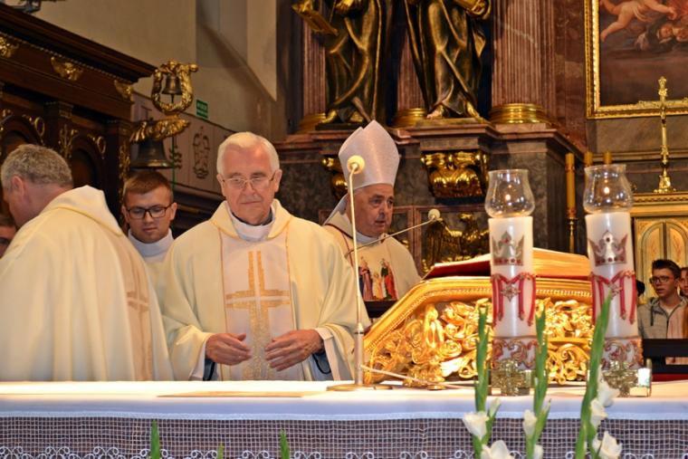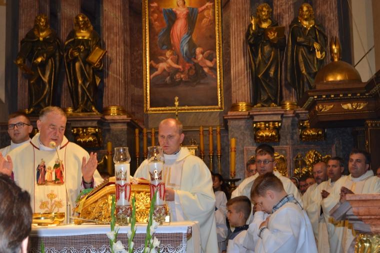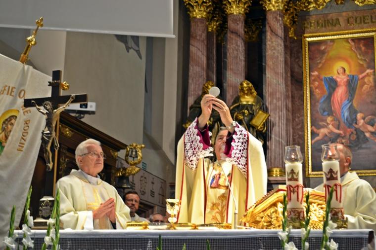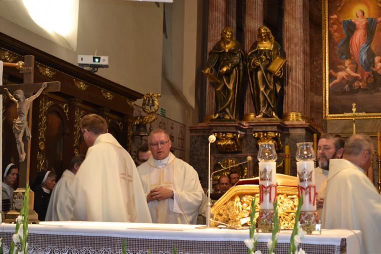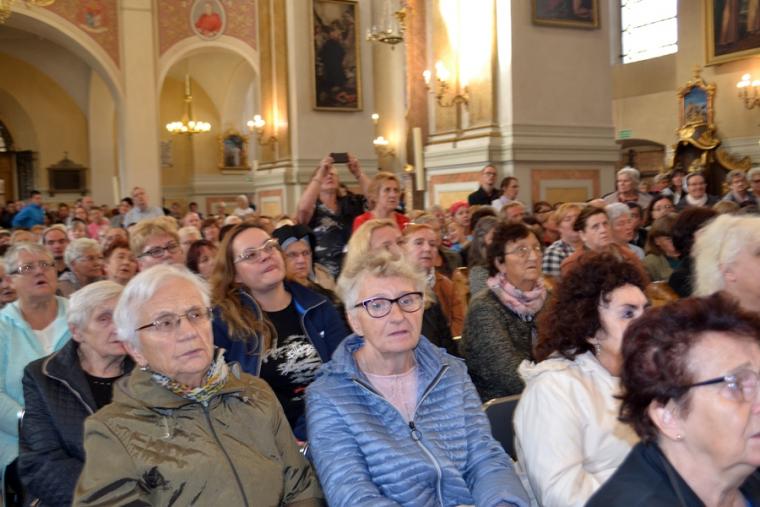 Po konferencji w Kaplicy Cudownego Obrazu zostało odprawione nabożeństwo do św. Józefa, które poprowadził ks. Michał Świgoniak. Ku niebu popłynęły słowa powitania św. Józefa, podziękowania za otrzymane łaski, ale także prośby, które w sobotnie przedpołudnie zostały złożone w sanktuarium. Po nich odmówiona została Litania do św. Józefa. Gdy zegar na wieży wybił godzinę dwunastą odśpiewany został Anioł Pański. Po modlitwie ks. prałat Jacek Plota, skierował słowa powitania do pielgrzymów. Najważniejszym punktem sobotniego spotkania ze Świętym Józefem była Eucharystia. Przewodniczył jej ks. prałat Jacek Plota, kustosz tego wyjątkowego miejsca, a współcelebransami kapłani przybyli z wiernymi ze swoich parafii. Homilię podczas Mszy św. wygłosił ks. Szymon Rybak. Rozpoczynając podkreślił, że nie jest przypadkiem, że znaleźliśmy się w Narodowym Sanktuarium Świętego Józefa właśnie w tym dniu. Zachęcał do tego, by poszukać samodzielnie odpowiedzi na pytania, po co się tutaj znaleźliśmy? Co św. Józef chce powiedzieć każdemu z nas? Nawiązując do słów Ewangelii (Łk8,4-15) podkreślił, że Pan Bóg jest tym, który sieje Słowo, niezależnie od tego, gdzie ono padnie, mając nadzieję, że wyda ono plon. Zaznaczył, że patrząc na życie św. Józefa widzimy, że jest ono żyzną glebą. Następnie ks. Szymon przywołał historię którą kiedyś usłyszał, a dotyczyła ona pytania, jakie konająca matka postawiła synowi kapłanowi: Czy ty naprawdę, żyjesz z Jezusem? Matka podkreśliła, że nie pyta syna kim jest, jakie ma znajomości, jaką ma władzę, ale czy naprawdę żyje z Jezusem. Kontynuując kaznodzieja podkreślił, że nie interesują go znajomości, pozycja społeczna, status materialny, decyzje, które mają do podjęcia zebrani w sanktuarium, ale interesuje go to czy naprawdę żyją z Jezusem. Jednocześnie podkreślił, że nie chodzi tutaj o deklaracje, ale o autentyczne życie wiarą. Ks. Szymon zachęcał, by szukać odpowiedzi na pytanie: kim jest dla nas Jezus, ale nie w deklaracji, tylko w konkretnych sytuacjach życiowych, podczas spotkań z różnymi ludźmi, w podejmowanych decyzjach. Podkreślał, że patrząc na św. Józefa widzimy, że nie składał Bogu wielkich deklaracji, ale cały czas żył słowem Bożym, mówił Bogu o swoich lękach.