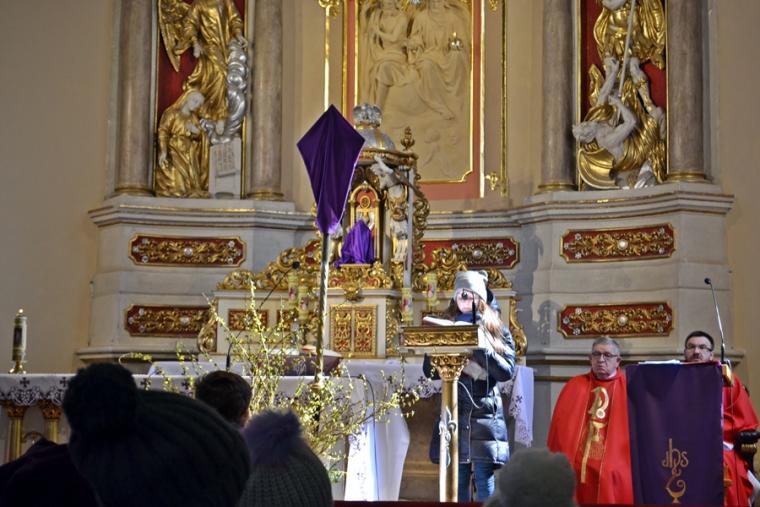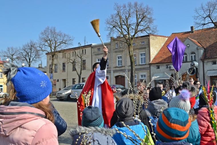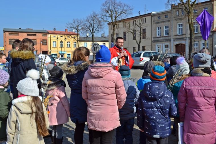 Młodsi zebrali się o godz. 10:50 przy figurze Serca Jezusowego na Rynku. Tu ks. wikariusz Krzysztof odczytał fragment Ewangelii opisujący wjazd Jezusa do Jerozolimy, następnie odmówił modlitwę i pobłogosławił przyniesione przez wiernych, głównie dzieci palmy. Po pobłogosławieniu palm zebrani na rynku udali się procesjonalnie do kościoła, gdzie ks. wikariusz Krzysztof Lipiński wraz z ks. kan. Grzegorzem Klapą sprawowali Eucharystię. W słowie skierowanym do zebranych w mikstackim wieczerniku ks. wikariusz podkreślił znaczenia dla wierzących nadchodzących dni Triduum Paschalnego. Zachęcał do uczestnictwa w nim zarówno dorosłych, jak i dzieci. W słowach skierowanych do rodziców zwrócił uwagę, że to na nich spoczywa obowiązek wyjaśnienia dzieciom znaczenia Triduum Paschalnego. Podkreślił, że najlepiej można to uczynić biorąc wspólnie w nim udział. Trudno jest wyjaśnić, opowiedzieć – jak powiedział jego istotę.