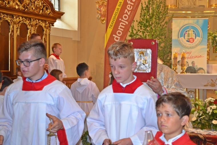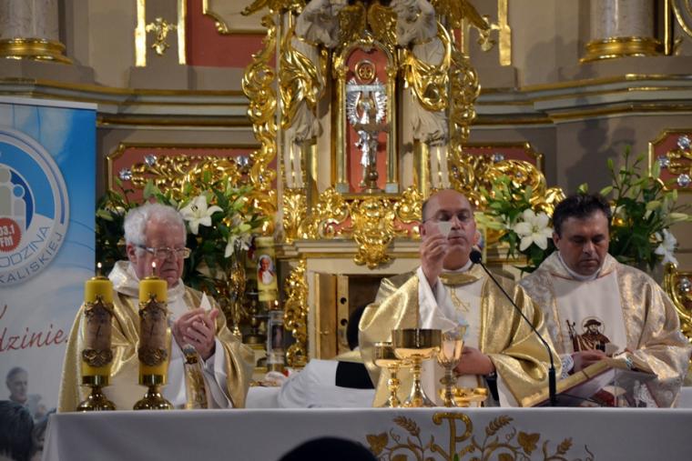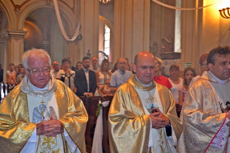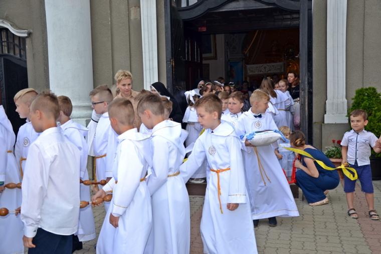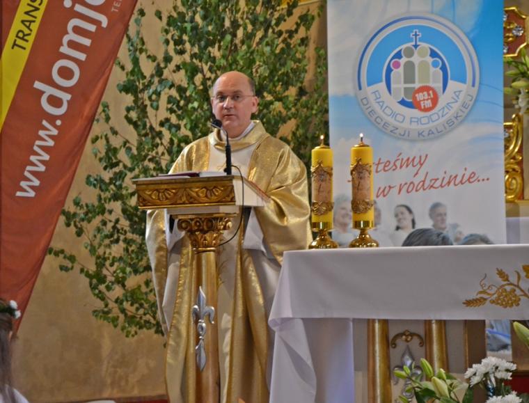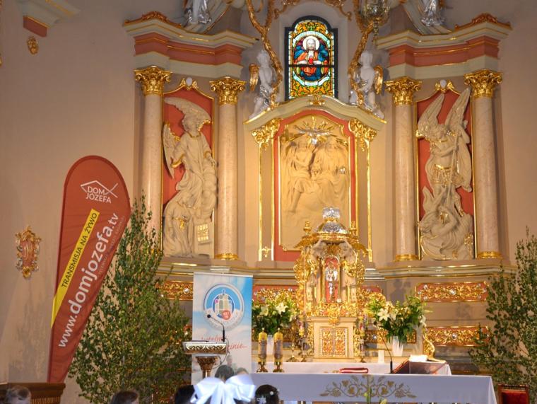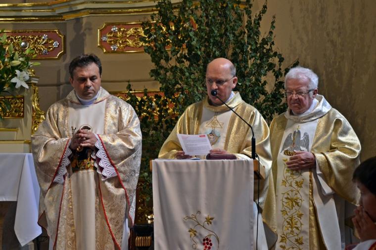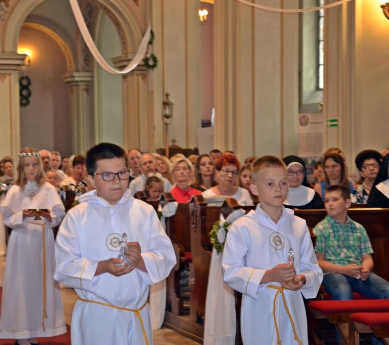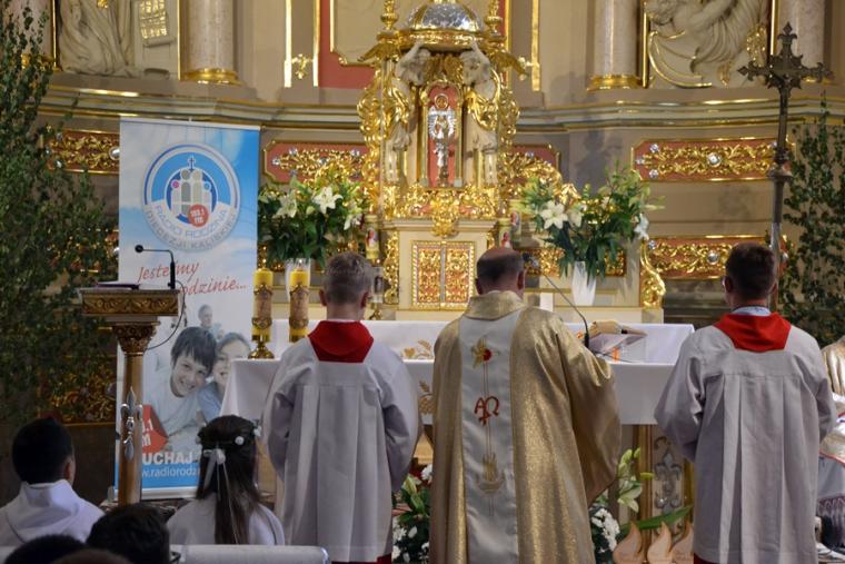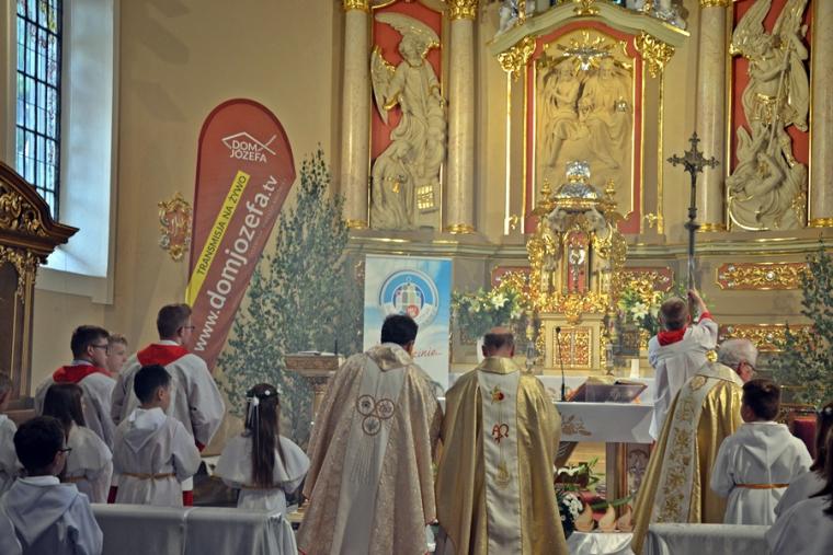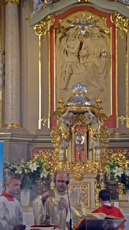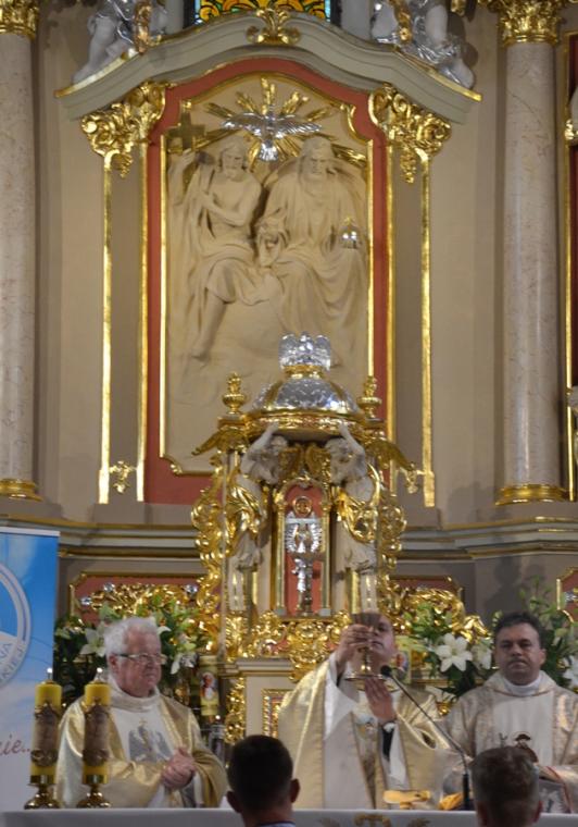 Bogata w wydarzenia była w mikstackiej parafii niedziela 16 czerwca . W tym dniu w całym Kościele obchodzona była uroczystość Trójcy Przenajświętszej. Dla naszej wspólnoty był to dzień wyjątkowy, dzień odpustu, bo od wieków parafii patronuje Trójca Święta. Uroczystej sumie odpustowej odprawionej o godz. 11:00 przewodniczył w tym roku ks. Andrzej Wojciechowski, proboszcz parafii pw. Świętego Michała Archanioła w Czempiniu. W czasie sumy odpustowej zakończenie „ Białego Tygodnia” przeżywały dzieci, które w uroczystość Zesłania Ducha Świętego pierwszy raz w sposób pełny uczestniczyły we mszy świętej, natomiast uczniowie klasy czwartej wspominali rocznicę swojej I Komunii Świętej. Wraz z księdzem Andrzejem Wojciechowskim, stanęli ks. kan. Krzysztof Ordziniak oraz ks. kan. Zbigniew Mielcarek, który czterdzieści dwa lata temu w uroczystość Trójcy Świętej sprawował w mikstackiej farze mszę świętą prymicyjną. Na początku mszy świętej ksiądz proboszcz przedstawił przewodniczącego koncelebrze księdza Andrzeja. Podkreślił, że jest następcą ks. Franciszka Ksawerego Ruszczyńskiego w Czempiniu, w parafii do której posłany został budowniczy naszej fary w dwa lata po jej konsekracji. W Czempiniu w parafii pw. Świętego Michała Archanioła sprawował posługę w latach 1920-1961. Ks. kan. Krzysztof zaznaczył, że ks. Andrzej Wojciechowski jest kolegą kursowym syna naszej parafii ks. Michała, a więc niedawno obchodził 25-lecie kapłaństwa. Homilię podczas uroczystej sumy wygłosił przewodniczący koncelebrze ks. Andrzej. Można w niej wyodrębnić dwie części. W pierwszej kaznodzieja nawiązując do słów Ewangelii zachęcał byśmy dziękowali Bogu za Bożego Ducha, który przypomina nam prawdę. Podkreślił, że ta prawda jest przekazywana od dwóch tysięcy lat, głoszona w naszych parafiach i prowadzi nas do zbawienia. Ks. Andrzej zaakcentował, że w uroczystość Trójcy Przenajświętszej dziękujemy za Boga Ojca, który stworzył świat, za Syna Bożego, który odkupił świat, wybawił nas od śmierci i grzechu, dziękujemy za Ducha Świętego, który nas prowadzi, oświeca nas, byśmy nie zeszli z Bożych dróg. Kaznodzieja nawiązał do medalionu Trójcy Przenajświętszej znajdującego się w kościele pw. Świętego Michała Archanioła w Czempiniu podkreślił, że cała Trójca Święta przedstawiona jest jako wspólne działanie Boga dla naszego zbawienia.