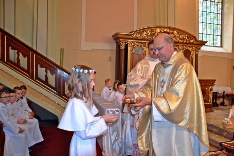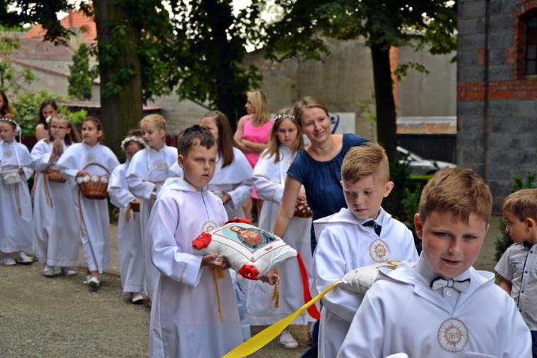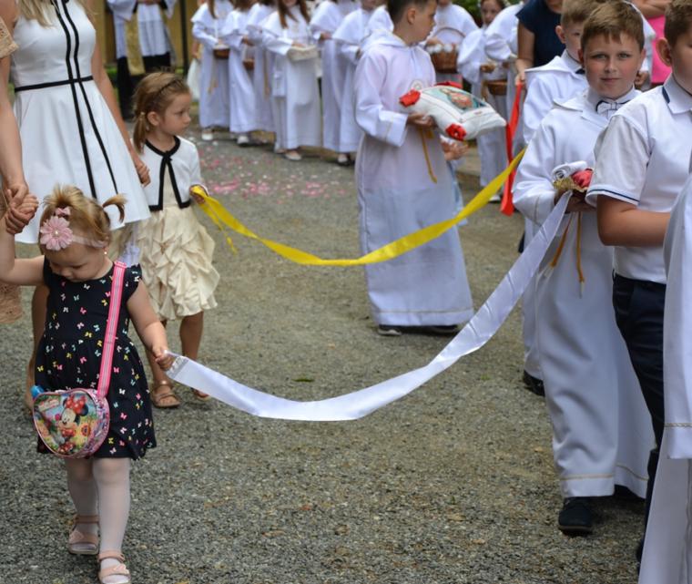 W procesji z darami dzieci przyniosły chleb wodę i wino oraz hostie. Po zakończeniu Mszy Świętej został wystawiony Najświętszy Sakrament i odmówiona Litania do Trójcy Przenajświętszej, a następnie wyruszyliśmy z procesją wokoło kościoła. Po błogosławieństwie udzielonym Najświętszym Sakramentem licznie zebranym w mikstackim wieczerniku wiernym wybrzmiała pieśń „Boże coś Polskę…”.