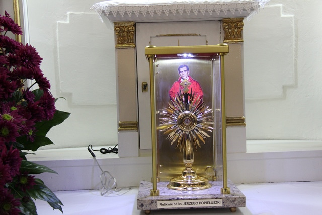 Relikwie bł. ks. Jerzego Popiełuszki zostały przyniesione w procesji z darami przez przedstawicieli rodziny zmarłego ks. prof. Antoniego Lewka.