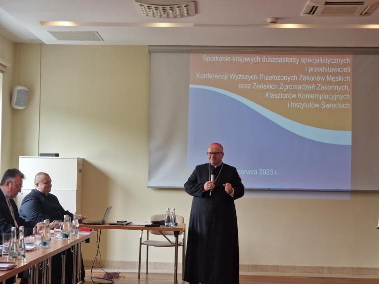 Z zebranymi w Warszawie krajowymi duszpasterzami środowisk specjalistycznych i przedstawicielami Konferencji Wyższych Przełożonych Zakonów Męskich oraz Żeńskich Zgromadzeń Zakonnych, Klasztorów Kontemplacyjnych i Instytutów Świeckich łączył się on-line bp Andrzej Czaja, przewodniczący Komisji Duszpasterstwa KEP. Podczas spotkania, wraz z bp. Waldemarem Musiołem, sekretarzem Komisji, zaprezentował on Program Duszpasterski Kościoła w Polsce na rok 2023/2024, którego hasłem będą słowa: „Uczestniczę we wspólnocie Kościoła”. Materiały omawiające program zostały zebrane w pięciu zeszytach tematycznych i zostaną rozesłane do wszystkich parafii w Polsce.