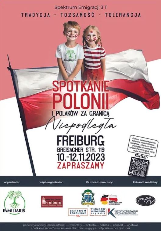 Poradnia "Familiaris" we Freiburg (Niemcy) zaprasza w dniach 10 - 12 listopada na wyjątkowe wydarzenie, które obchodzone będzie w duchu patriotyzmu, wolności i niepodległości: "Spotkanie Polonii i Polaków za granicą - Niepodległa". Myślami przewodnimi tego spotkania będą "Spektrum Emigracji 3T" - Tradycja, Tożsamość i Tolerancja. To tematy, które chcemy zgłębić i omówić wspólnie z Wami, aby zrozumieć nasze dziedzictwo i dążyć do jeszcze silniejszej wspólnoty. Ten czas spędzony razem będzie naszym hołdem dla Niepodległej i okazją do uczczenia naszych korzeni i wspólnej historii.