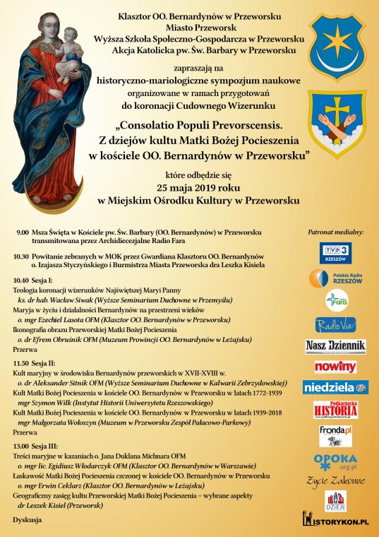 Klasztor OO. Bernardynów w Przeworsku, Miasto Przeworsk, Wyższa Szkoła Społeczno-Gospodarcza w Przeworsku i Akcja Katolicka pw. św. Barbary w Przeworsku zapraszają na historyczno-mariologiczne sympozjum naukowe pod nazwą „Consolatio Populi Prevorscensis. Z dziejów kultu Matki Bożej Pocieszenia w kościele OO. Bernardynów w Przeworsku”, które odbędzie się w sobotę 25 maja 2019 r.