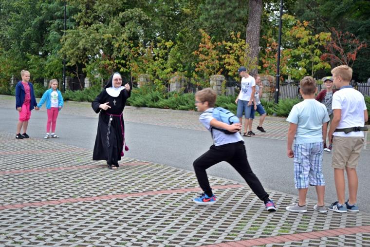 Jak okazało się w drugim dniu spotkań, dzieci sumiennie wykonały pracę domową. Było jeszcze jedno zadanie, gdyż w trakcie tegorocznej Szkoły pojawił się kufer dziedzictwa. Podczas poszczególnych dni dzieci będą wkładały do niego rysunki, fotografie, opisy, tego co składa się na nasze dziedzictwo kulturowe. Na początek dzieci miały przyjrzeć się dziedzictwu należącemu do nich. Kufer w czwartkowe przedpołudnie zaczął się wypełniać. W tym drugim dniu w Rochowej Szkole był oczywiście czas na modlitwę nowennową podczas której ks. kan. Krzysztof odczytywał przyniesione przez młodych intencje. Potem dzieci uczciły relikwie św. Rocha. Po modlitwie przyszedł czas na wspólny śpiew. W jego prowadzeniu niezastąpiona okazała się s. Małgorzata, która pewnie już do końca spotkań w Rochowej Szkole będzie dbała o to, by rozśpiewać dzieci, a także organizować dla nich zabawy ruchowe.Ta wakacyjna szkoła została zorganizowana m.in. po to, by dzieci poznały życie św. Rocha, a także wartości, którymi kierował się On w swoim życiu. W tym celu ksiądz kustosz wykorzystał fragment programu „Ziarno” poświęconego św. Rochowi. Dodajmy, że fragmenty tego programu były realizowane na terenie naszej parafii. Uczestniczyli w nim młodzi Mikstaczanie. W drugim dniu omówione zostały atrybuty, z którymi na obrazach i rzeźbach przedstawiany jest św. Roch. Stało się to impulsem do wskazania podobieństw i różnic w ikonograficznych przedstawieniach św. Rocha i św. Jakuba. Podczas spotkania dzieci obejrzały film animowany „N- jak niewidomy”, w którym mogły zobaczyć w jaki sposób można pomagać osobom niewidomym bądź niedowidzącym. Ksiądz kustosz omawiając strój św. Rocha zwrócił uwagę na laskę pielgrzymią. Z filmu dzieci dowiedziały się, że biała laska może być bardzo pomocna dla osoby niewidomej. Nie zabrakło także opowieści o psach przewodnikach osób niewidomych. Film był forma przygotowania do spotkania z gościem, który tego dnia odwiedził uczestników Szkoły Świętego Rocha. Mamy nadzieję, że spotkanie to na długo pozostanie w ich pamięci. Kim był ten niezwykły gość? Otóż na spotkanie z młodymi przybyła Pani Gabriela Przygoda. Pani Gabriela jest osobą niewidomą, straciła wzrok mając 20 lat. Podczas spotkania Pani Gabrysia przedstawiła się w kilku zdaniach, a następnie bardzo chętnie odpowiadała na pytania młodych, trzeba przyznać, że było ich bardzo wiele. Młodzi pytali m.in. o to jak radzi ona sobie z czynnościami dnia codziennego takimi jak sprzątanie, gotowanie, prasowanie, mycie, poruszanie się po mieszkaniu, dobieranie kolorystyki ubrania, pakowanie walizki na wyjazd. Pani Gabrysia podkreślała, że pomocne są tu często zdobycze techniki. Podkreśliła, że osoby niewidome mają z reguły bardzo uporządkowane życie. Troska o ład ułatwia im funkcjonowanie, gdyż wiedzą wtedy gdzie mogą znaleźć konkretne przedmioty. Jest jeszcze jedna rzecz, którą należy powiedzieć o gości. Pani Gabriela została obdarowana przez Pana Boga pięknym głosem. Dane nam było posłuchać w sanktuarium pieśni Ave Maria Jasnogórska Pani. Może kiedyś uda się Pani Gabrysi wydać płytę, życzymy jej tego z całego serca. Po licznych pytaniach zadanych przez młodych ksiądz kan. Krzysztof zapytał Panią Gabrysię co chciałaby powiedzieć młodym ludziom. Zacytujmy to przesłanie: „Żeby żyli każdym dniem, żyli tak, żeby nikt przez nich nie płakał, bo jeżeli jest się młodym nie zwraca się uwagi na to co się robi, krzywdzi się ludzi, to to wszystko potem wraca, jeżeli się ich nie krzywdzi, a stanie się nam krzywda to ma się pomoc z każdej strony, ale jeśli się tego nie zauważa i tego nie robi to wtedy jest naprawdę ciężko”.