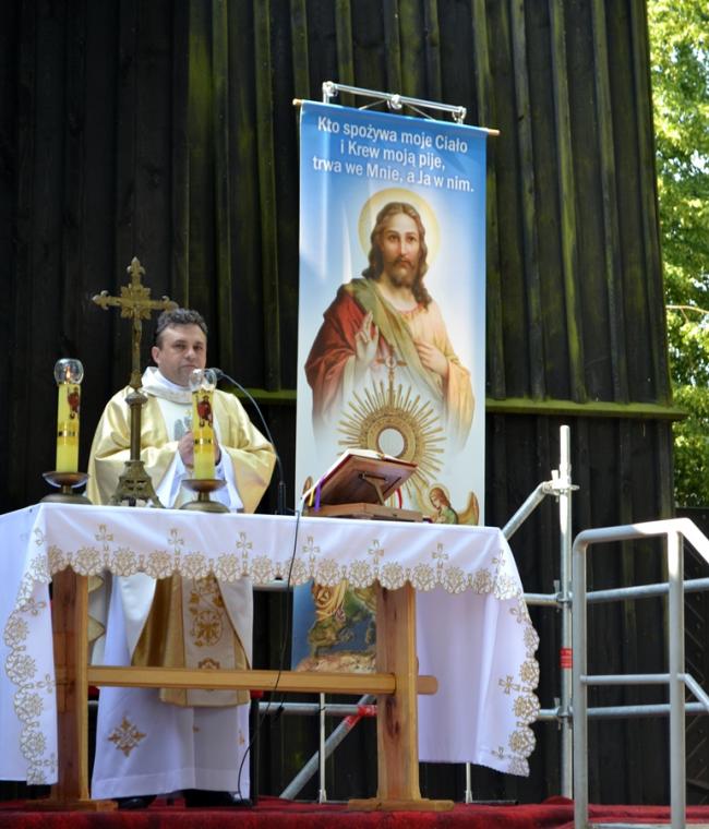 Wracając do głównego wątku rozważania kaznodzieja zachęcał wiernych do postawienia sobie pytania: „Co Jezus ukryty pod postacią Chleba, zobaczy w czasie wędrowania przez nasze miasto i parafię? Jaką zobaczy Ojczyznę, jaki Kościół, jaką rodzinę, jakiego człowieka?”. W dalszej części homilii celebrans podkreślił, że uroczystość Bożego Ciała jest wielkim pokłonem złożonym Jezusowi, ale jednocześnie zachęcał, by odpowiedzieć sobie na pytanie, czy zawsze oddajemy Bogu pokłon. Zaznaczył, że różnie z tym bywa. Myślą przewodnią rozważania były słowa pieśni „ Zróbcie Mu miejsce…”. Kończąc rozważanie ks. kanonik powiedział: „ Mam do Was ogromną prośbę w tym roku, abyśmy zrobili Bogu miejsce w naszych kalendarzach, które są tak mocno zapełnione różnymi sprawami”. Parafia podzielona jest na rejony, jak podkreślił ks. proboszcz nie tylko po to, by wywiązywały się one m.in. z organizacji procesji w poszczególnych dniach, ale i po to, by ich mieszkańcy w tych dniach uczestniczyli w Eucharystii. Jak odpowiemy na to zaproszenie? Czy zrobimy miejsce dla Pana w naszych sercach i w naszych kalendarzach. Tak wielu z nas przyjęło Jezusa w Komunii Świętej. Zrobiliśmy Mu miejsce w naszych sercach. Po Mszy Świętej odbyło się wystawienie Najświętszego Sakramentu, następnie wraz z Jezusem ukrytym pod postacią Chleba wyruszyliśmy w procesji do czterech ołtarzy. Przedstawiciele poszczególnych regionów przygotowali ołtarze. Trasa tegorocznej procesji wiodła od Diecezjalnego Sanktuarium Świętego Rocha do krzyża misyjnego przy naszej farze, której 100- lecie konsekracji przeżywać będziemy w październiku. Jak to już staje się tradycją w naszej wspólnocie co roku procesja odbywa się inna trasą, bo Jezus przychodzi do wszystkich. Przy poszczególnych ołtarzach wsłuchiwaliśmy się w rozważania, których myślą przewodnia była EUCHARYSTIA. Na pierwszym ołtarzu znajdowało się hasło: Eucharystia jest Ofiarą. W słowach rozważania usłyszeliśmy m.in. „ W opisie Eucharystii bardzo ważne są cztery czasowniki: brać, błogosławić, łamać, dawać. Dzięki nim możemy zaobserwować, na czym polega logika ofiary Jezusa”. O tym jak wielka jest tajemnica Boga i o Eucharystii jako pokarmie dla duszy mowa była w rozważaniu przy drugim ołtarzu. Na trzecim ołtarzu widniało hasło: „Eucharystia jest sakramentem zjednoczenia”. Tu do wiernych popłynęło przesłanie: „ Ten, który pokonał śmierć może wejść pomimo drzwi zamkniętych, pomimo zakrytych bielmem oczu i zatwardziałych serc. Wówczas, gdy On wychodzi nam naprzeciw , ukazuje się jako żyjący, dający życie”. Hasło na trzecim ołtarzu zachęcało nas do spojrzenia na Eucharystię jako zadatek nieśmiertelności. Tu wybrzmiało także Te Deum laudamus. Procesję zakończyło błogosławieństwo Najświętszym Sakramentem na cztery strony świata. Podczas procesji niesione były sztandary i feretrony. Uroczystość uświetniła orkiestr parafialna i chór. A tuż przed baldachimem kroczyły dziewczęta sypiące kwiatki. Było ich podczas tegorocznej procesji bardzo dużo. Jezus ukryty pod postacią Chleba przemierzał ulice naszego miasteczka obsypywany płatkami kwiatków.