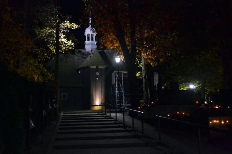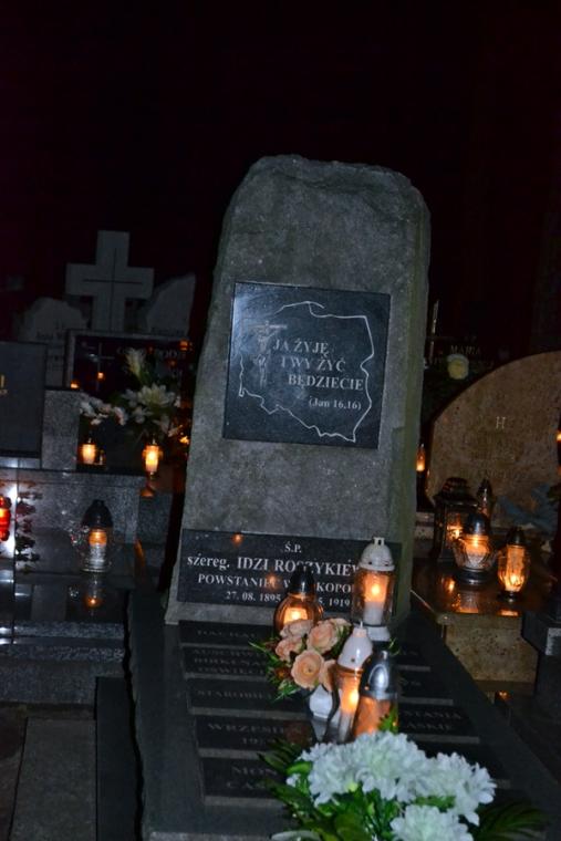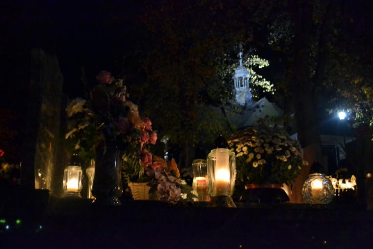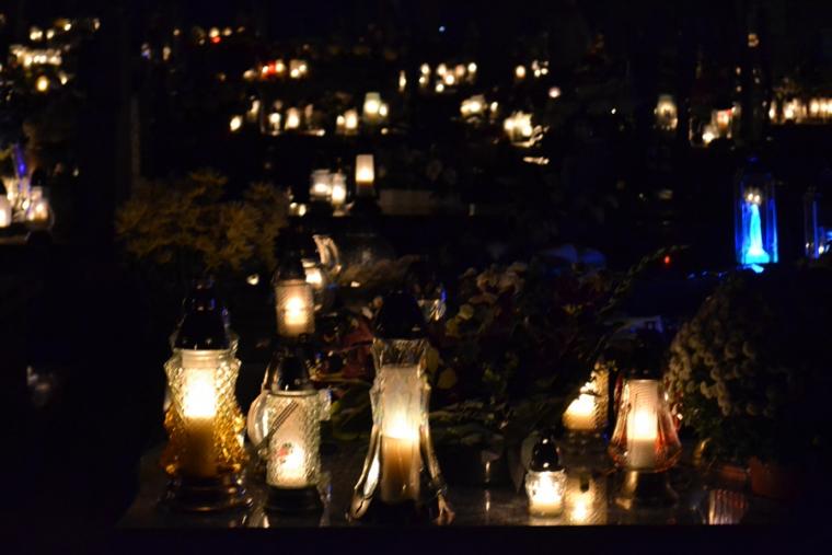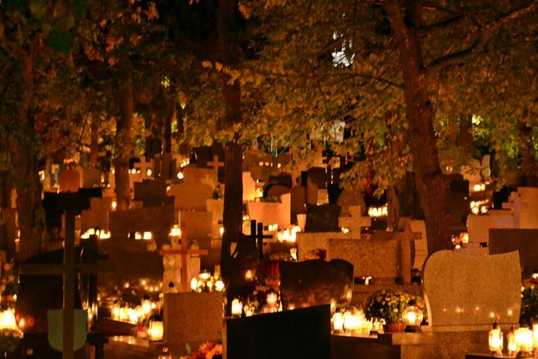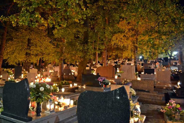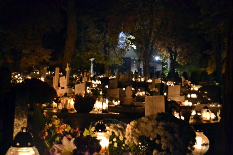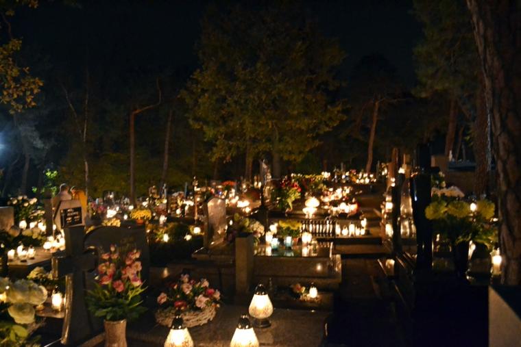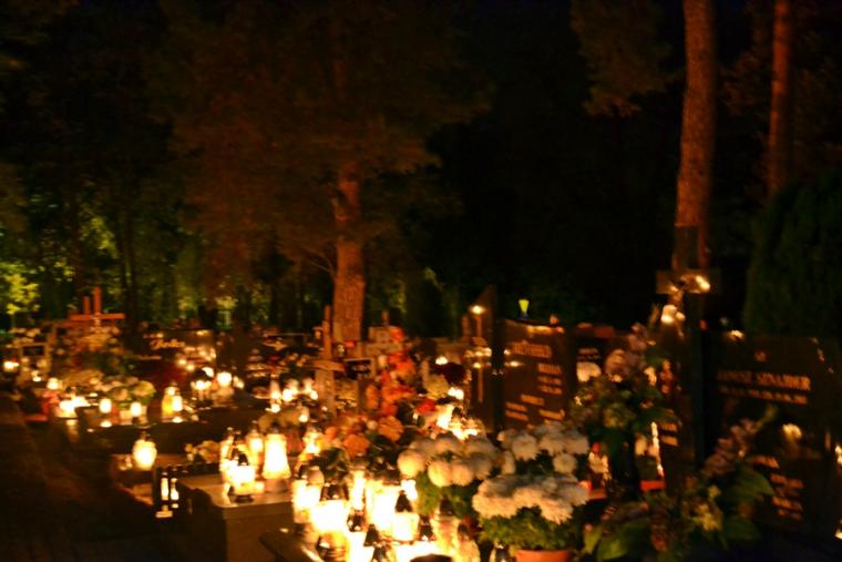 Mikstacki cmentarz wieczorem w uroczystość Wszystkich Świętych