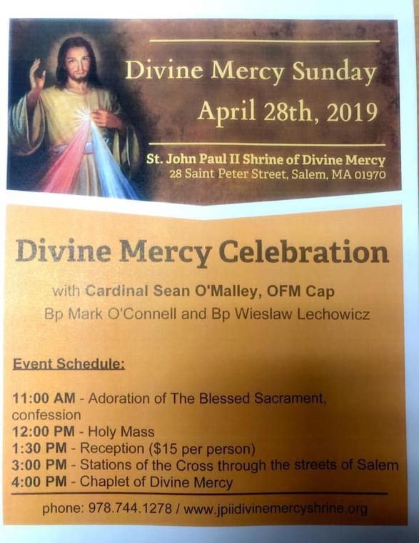 28 kwietnia w Niedzielę Bożego Miłosierdzia w Salem Polacy wraz z Amerykanami czcili Boże Miłosierdzie Eucharystią pod przewodnictwem kard. O’Malley, drogą krzyżową ulicami miasta i odmówieniem koronki do Bożego Miłosierdzia. W uroczystościach wziął Delegat KEP ds. Duszpasterstwa Emigracji Polskiej, bp Wiesław Lechowicz