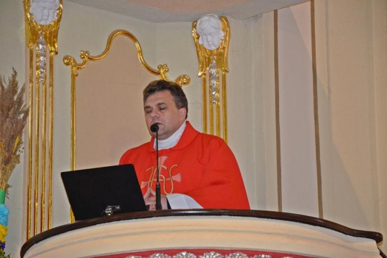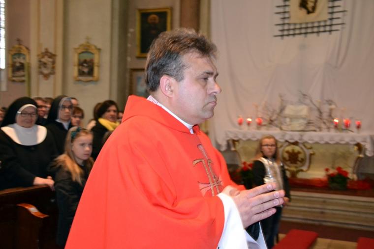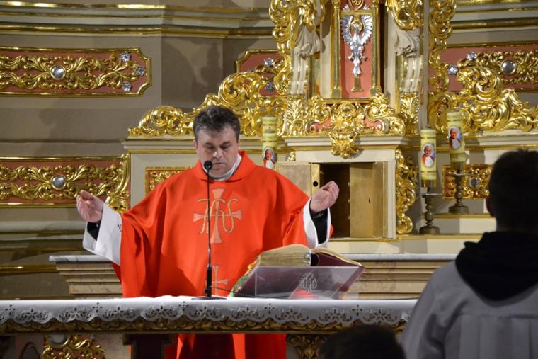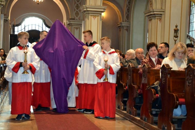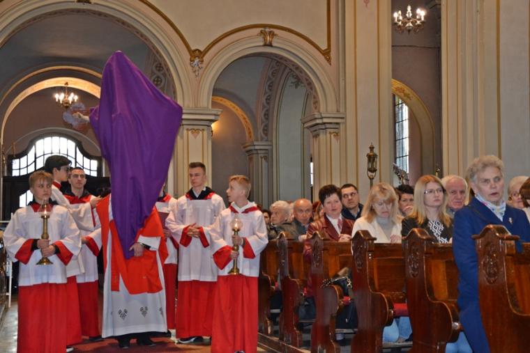 Liturgii Wielkopiątkowej przewodniczył ks. kan. Krzysztof Ordziniak. Niezwykła cisza i modlitewna zaduma zapanowała w kościele, gdy kapłan w tzw. geście właściwym Wielkiego Piątku leżał krzyżem przed ołtarzem. Podczas liturgii wielkopiątkowej odczytany został opis Męki i Śmierci Pana Jezusa. Podczas liturgii wielkopiątkowej kilka słów refleksji na temat krzyża w życiu człowieka skierował do licznie zebranych w świątyni wiernych ks. kan. Krzysztof. Kapłan zaakcentował, że Wielki Piątek jest dniem krzyża. Wskazał, że Kościół zatrzymuje się, aby ukazać ludziom cenę, za jaka Chrystus nas zbawił. Dodał jednak, że milczenie Wielkiego Piątku nie jest milczeniem rozpaczy, ale zadumy i refleksji nad miłością, która jest zdolna do największej ofiary. Kaznodzieja zachęcał zebranych do modlitwy i postawienia sobie pytania, czy potrafimy przyjąć krzyż. Krzyż, jak podkreślał, stoi w centrum Liturgii. Zwrócił uwagę na obnażony ołtarz, na którym brakuje obrusów, świeczników, kwiatów. Był natomiast pewien bardzo ważny gest. Powiedział: „celebrans(…) padł na twarz. To przejmujący znak modlitwy księdza leżącego na posadzce kościoła- jak podczas święceń kapłańskich. Trochę tak, jakby liturgia chciała nam przypomnieć, że bycie księdzem, bycie chrześcijaninem, jest powiązane z wejściem w tajemnicę Krzyża”. W dalszej części rozważania kapłan przywołał obraz znajdujący się w starym klasztorze. Przedstawia on Jezusa niosącego wielki krzyż, a wokół Niego wielu ludzi z małymi krzyżykami w ręku. Kapłan wskazał, że każdy człowiek ma swój krzyż. Podkreślił, że autor tego obrazu chciał ludziom przypomnieć słowa Chrystusa: „ Jeśli kto chce pójść za Mną, niech się zaprze samego siebie, niech weźmie krzyż swój i niech Mnie naśladuje”. Kontynuując, ks. proboszcz Krzysztof podkreślał potrzebę podjęcia swego krzyża i podążania z nim za Chrystusem. Wskazał na wielorakość i różnorodność krzyży, które trzeba przyjąć w swoim życie. Jest ich tak wiele, jak wielu jest ludzi. Zwrócił uwagę na krzyż samotności, zdrady, odrzucenia, choroby, nieszczęśliwych wypadków, śmierci bliskich. Kontynuując powiedział: „Krzyż ma wiele imion. Jedno jest pewne: trzeba podjąć swój krzyż, aby upodobnić się do Chrystusa. Kto nie bierze swego krzyża, nie jest Mnie godzien - mówi Jezus”. Kapłan zwrócił uwagę wiernych, że aby zrozumieć i podjąć swój krzyż, trzeba zrozumieć krzyż Chrystusa. To z niego mamy czerpać siłę i moc. W końcowej części rozważania kapłan przywołał postać Karola Antoniewicza, autora pieśni: „ W krzyżu cierpienie, w krzyżu zbawienie…”. Wskazał trudne koleje jego życia: śmierć dzieci, żony. Jego żona w czasie choroby mówiła do niego: „Karolu, trzeba głośno dziękować, a cicho cierpieć”. Po jej śmierci wstępuje do jezuitów. Ma dar przemawiania do cierpiących. W czasie epidemii z wielkim oddanie posługuje chorym. Sam się zaraża i tuż przed śmiercią pisze pieśń „ W krzyżu cierpienie, w krzyżu zbawienie, w krzyżu miłości nauka…”