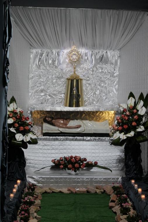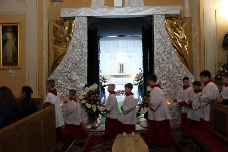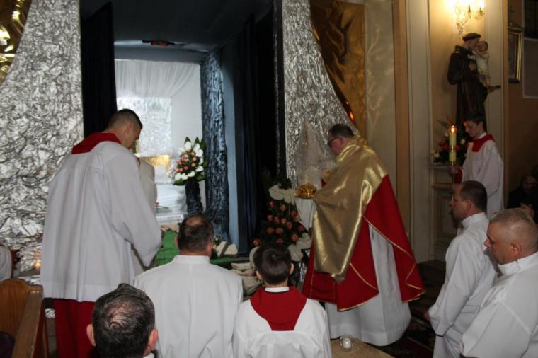 Procesja z Najświętszym Sakramentem w monstrancji okrytej białym przejrzystym welonem ~ symbolem całunu turyńskiego, w który owinięto ciało zmarłego Chrystusa, do Grobu Pańskiego zakończyła wielkopiątkową Liturgię Męki Pańskiej.