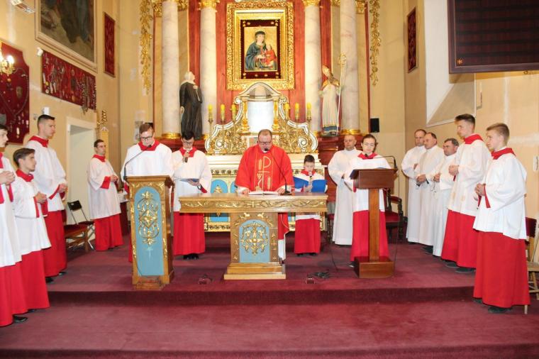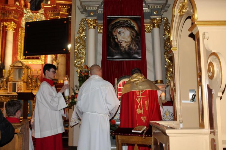 Niepowtarzalna wielkopiątkowa Liturgia Męki Pańskiej została odprawiona przez kustosza Sanktuarium, ks. kan. Łukasza Żurawskiego o godzinie 19:00. Rozpoczęła się ona od wejścia celebransa i asysty w ciszy do kościoła, którzy przed ołtarzem przez chwilę leżeli krzyżem. Po modlitwie wstępnej odczytane zostało proroctwo o Cierpiącym Słudze Jahwe i fragment Listu do Hebrajczyków. Następnie odczytany został, z podziałem na role, opis Męki Pańskiej według św. Jana.