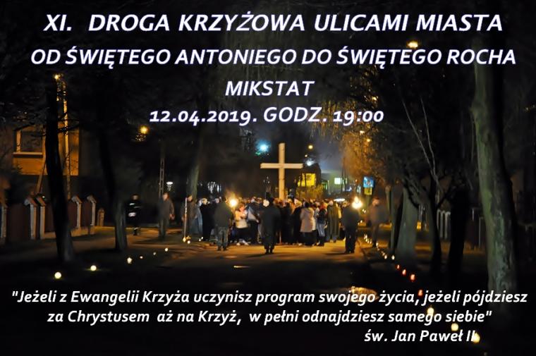 W piątkowy wieczór, 12. kwietnia, ulicami miasta podążać będą za krzyżem Chrystusa mieszkańcy Mikstatu. Mikstacka Plenerowa Droga Krzyżowa ulicami miasta rozpocznie się tradycyjnie o godz. 19:00 przy kapliczce św. Antoniego na ulicy Kaliskiej. W miejscu, w którym się znajduje stał kiedyś krzyż wykonany przez Pawła Brylińskiego. Tu grzebano ofiary epidemii cholery. Ostatnia stacja Drogi Krzyżowej zostanie usytuowana przy Diecezjalnym Sanktuarium Świętego Rocha. Dodajmy, że św. Roch jest m.in. patronem „ od morowego powietrza”. Plenerowa Droga Krzyżowa w Mikstacie tradycyjnie poprzedza dzień Sakramentu Pokuty i Pojednania w mikstackiej wspólnocie parafialnej. Stanowi więc okazję do refleksji, zadumy, ale i rachunku sumienia z naszej miłości względem Boga i bliźnich. Do tego, by wyruszyć za krzyżem Jezusa, jest wezwany każdy z nas, bo na każdym z nas spoczywa misja głoszenia Dobrej Nowiny. Skorzystajmy z propozycji i zaproszenia, które kieruje do nas Jezus dźwigający na swych ramionach na Golgotę krzyż, by tam za nas oddać swoje życie. Wyruszmy za Jego krzyżem i włączmy się w rozważanie Jego Męki i Śmierci. Włączmy się w wołanie: „ Któryś za nas cierpiał rany, Jezu Chryste, zmiłuj się nad nami”. Potrzebujemy Bożego zmiłowania, potrzebujemy doświadczenia miłości miłosiernej. Uczynisz Ewangelie Krzyża programem swego życia ? To okazja, by dać świadectwo swojej wiary, tak potrzebne współczesnemu człowiekowi.