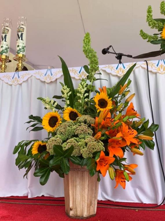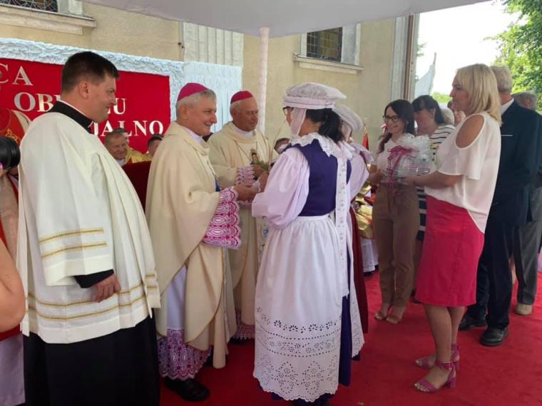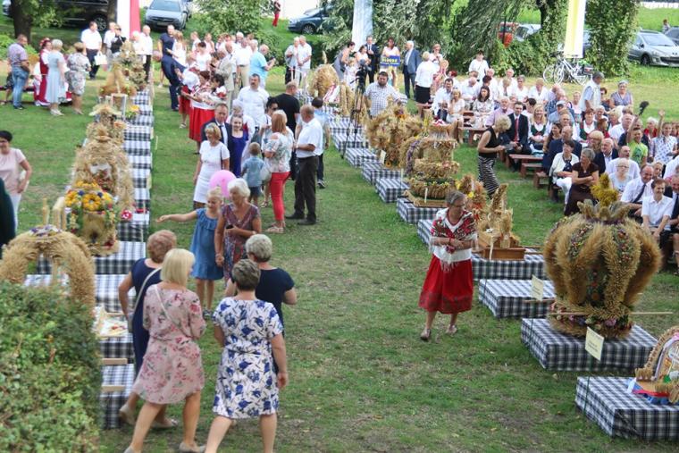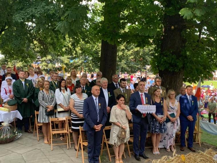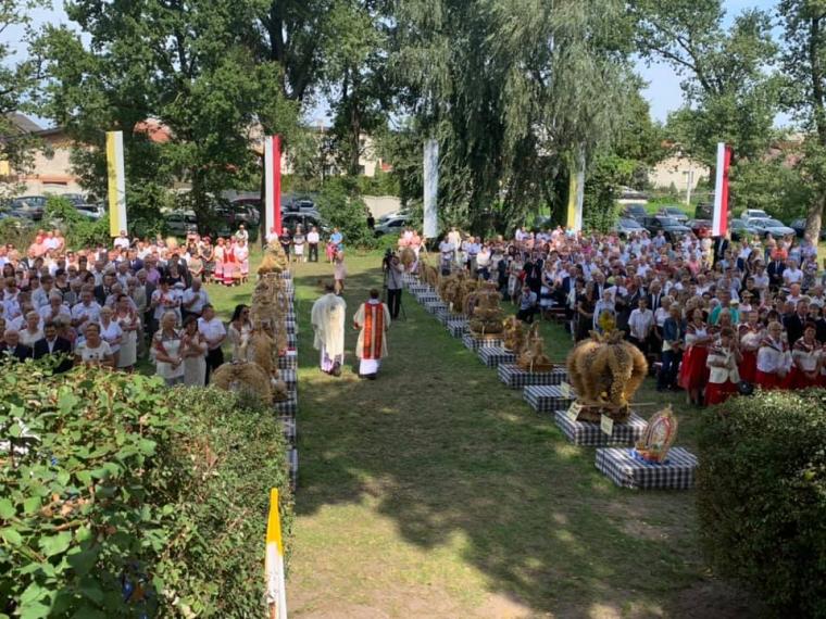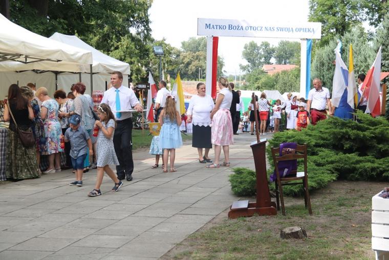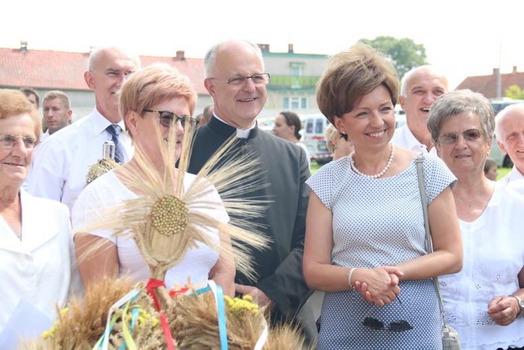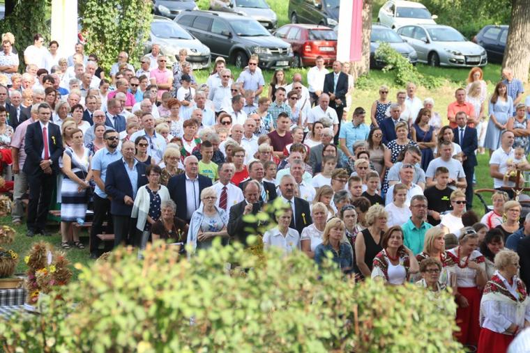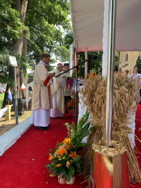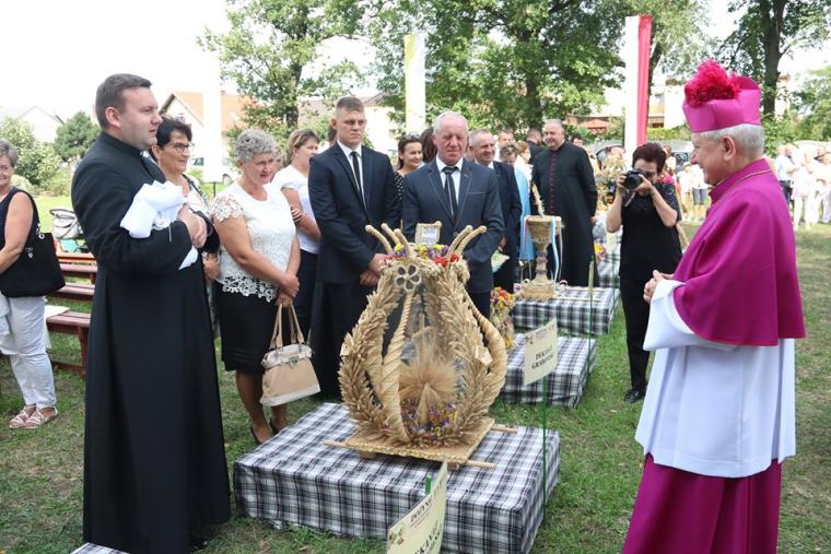 Po Eucharystii starostowie dożynek: Monika i Karol Grzeszczyk z Rudy w gminie Zduny oraz starostowie pomocniczy Agnieszka Kaj i Jan Jaskuła z Lutogniewa oraz Małgorzata Ziętek z Fijałowa i Bronisław Koncewicz z Długołęki w gminie Kobylin złożyli bochen chleba na ręce biskupa kaliskiego Edwarda Janiaka, kustosza Sanktuarium Matki Bożej Pocieszenia w Lutogniewie ks. kan. Łukasza Żurawskiego i starosty krotoszyńskiego Stanisława Szczotki. W swoim wystąpieniu biskup kaliski prosił, aby młode pokolenia uczyć miłości do ziemi: „Dzisiaj trzeba mówić dzieciom i wnukom o przodkach. Trzeba uczyć miłości do ojczyzny. Dzisiaj, kiedy jesteśmy w Europie i napływają do nas te wszystkie trendy, również negatywne to bardzo ważne jest, aby pielęgnować wiarę, uczyć modlitwy. W tej wielkiej Europie jesteśmy taką gwiazdą nadziei tradycji, świętości, miłości do Kościoła i ojczyzny.”.