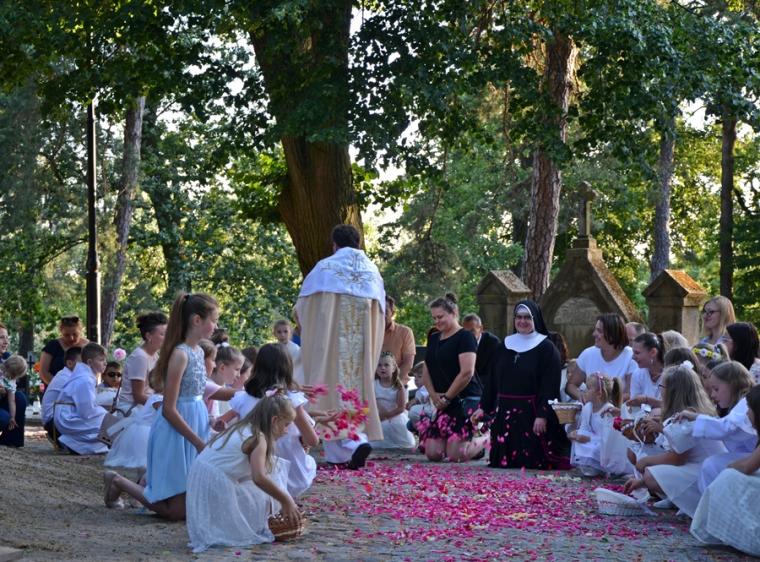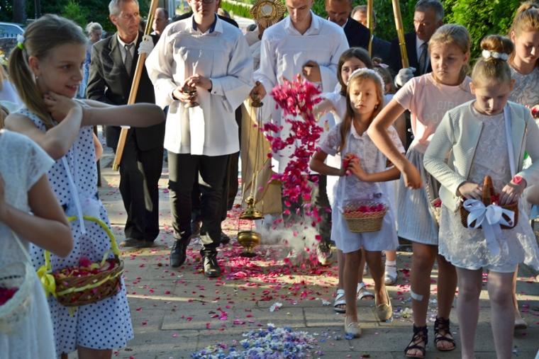 Po Mszy Świętej odbyło się wystawienie Najświętszego Sakramentu, odmówiliśmy Litanię do Serca Jezusowego. Następnie z Jezusem ukrytym pod postacią Chleba wyruszyliśmy alejkami cmentarnymi w procesji do czterech ołtarzu. Myślą przewodnią haseł, która znalazły się w tym roku na przygotowanych przez poszczególne rejony parafii była NIEDZIELA. Hasła skłaniały wiernych do spojrzenia na niedzielę w następujących aspektach: Niedziela dniem Kościoła, Niedziela dniem rodziny, Niedziela dniem wiary, Niedziela dniem człowieka. Procesję zakończyło błogosławieństwo Najświętszym Sakramentem na cztery strony świata. Następnie odbyło się poświęcenie wianków z ziół i kwiatów. To wyraz naszej wiary i zaufania Bogu. Przyniesione zostały pierwociny pól i łąk, by Bóg nam błogosławił, by nikomu nie zabrakło chleba powszedniego, bo tego będącego pokarmem dającym życie wieczne nigdy nie zabraknie… Obyśmy tylko chcieli się nim karmić… Zadziwiająca jest siła wiary i tradycji w naszej wspólnocie.
